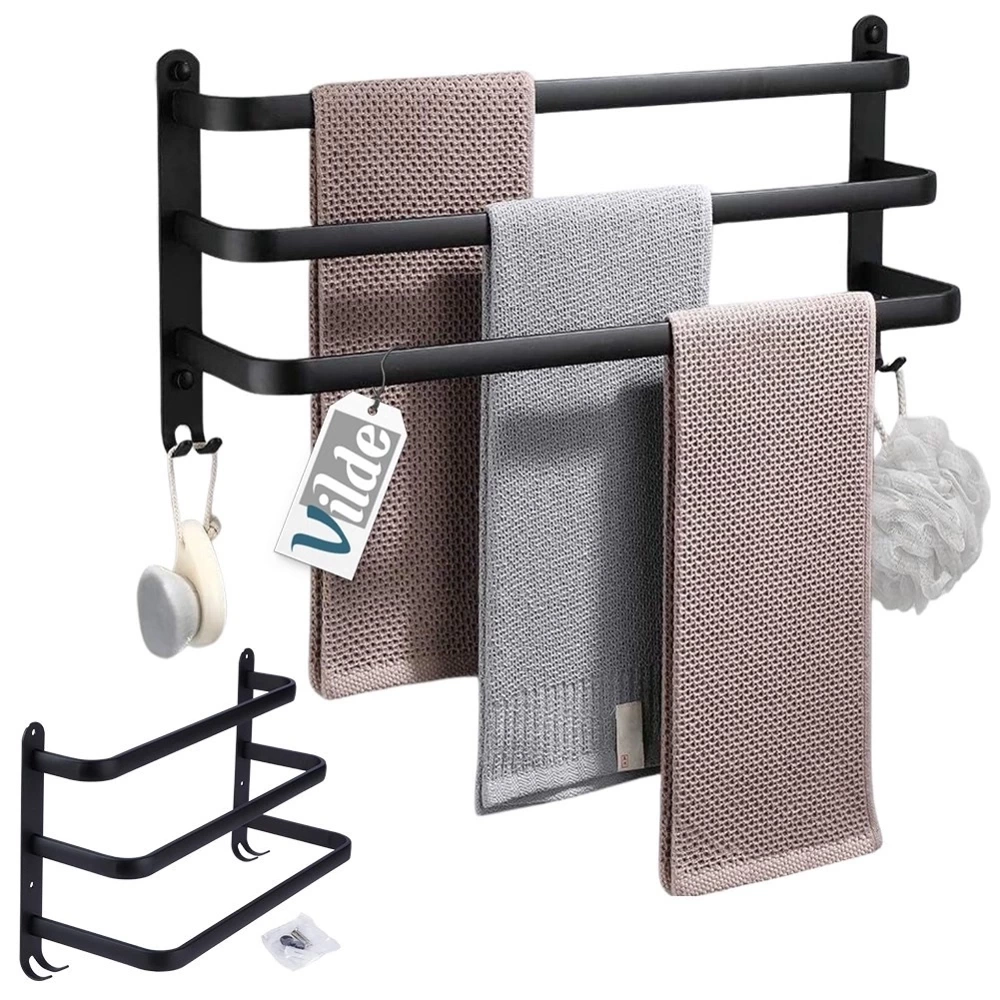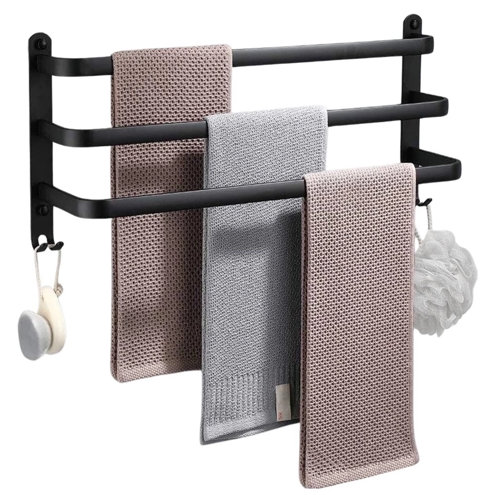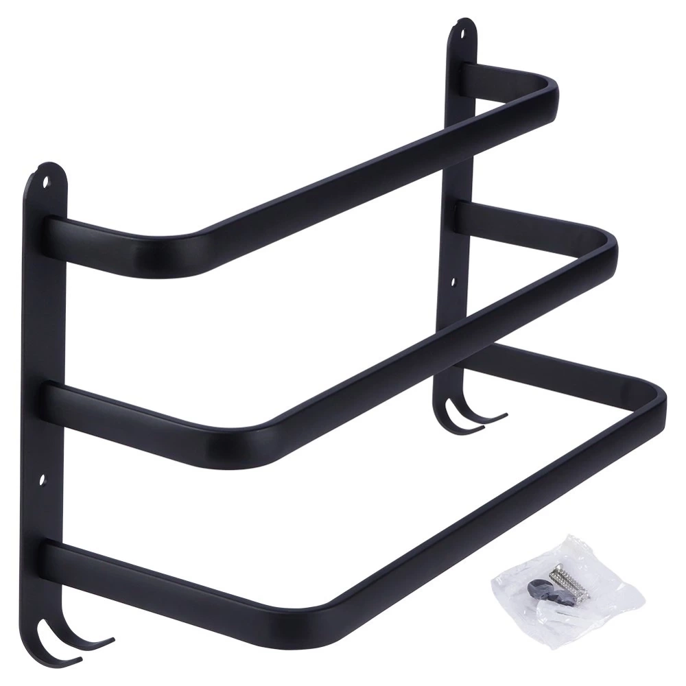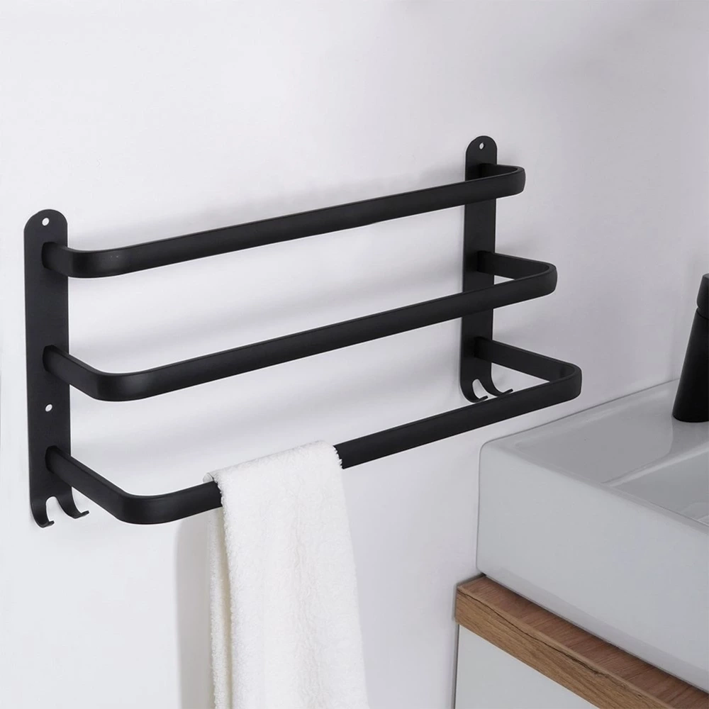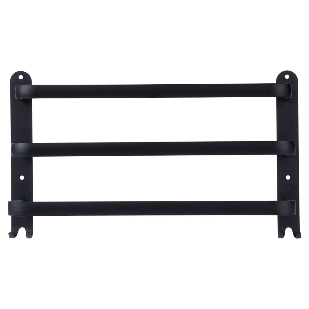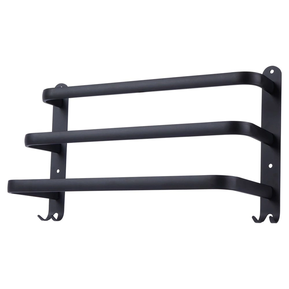 - Wieszak łazienkowy do zamocowania na ścianie. Posiada trzy przęsła do odwieszenia ręczników oraz cztery dodatkowe haczyki. Utrzymany w modnym, czarnym kolorze.