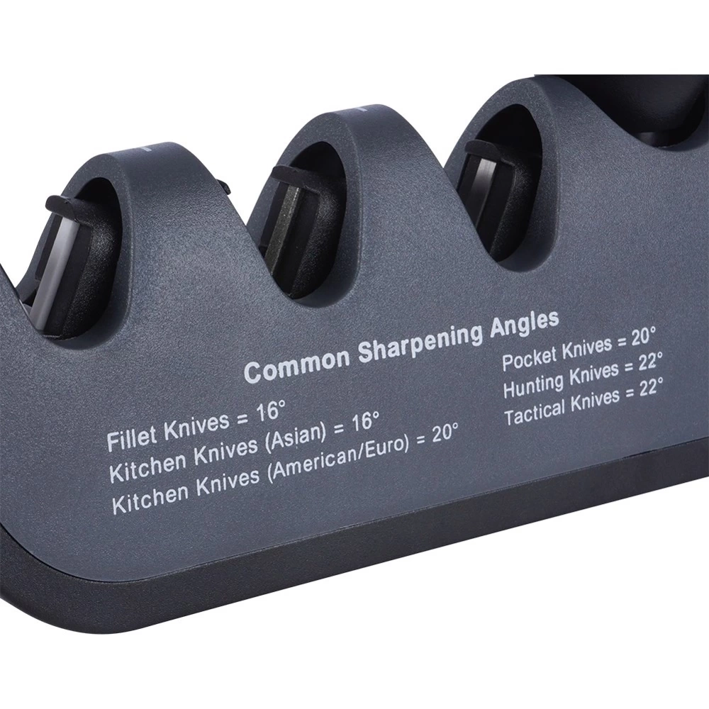 - NOWOCZESNA - Ostrzałka do ostrzenia noży kuchennych wyposażona w płynną regulację kąta ostrzenia 14-24°. Jest uniwersalna, więc daje możliwości ostrzenia różnego rodzaju noży np. noży stalowych, ceramicznych o różnych rozmiarach, a także nożyczek. Ostrzałka ma wymiary 29 x 4,5 x 7 cm. Posiada trzy różne ostrza do ostrzenia oraz dedykowane miejsce do ostrzenia nożyczek.