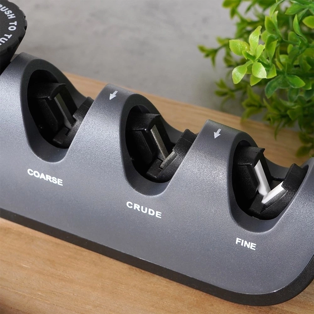 - SOLIDNA - Korpus wykonany z najwyższej jakości, wytrzymałego tworzywa w grafitowym kolorze. Funkcja ostrzenia wstępnego oraz polerowania. Ostrzałka jest lekka i wytrzymała. Łatwa w użyciu i przechowywaniu, nawet w szufladzie kuchennej.