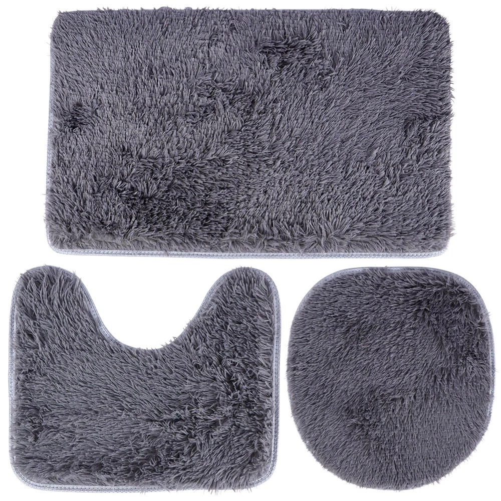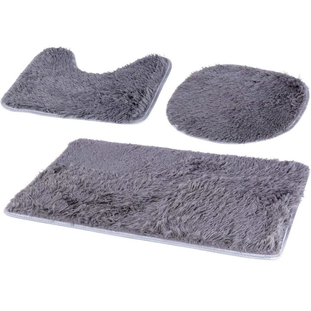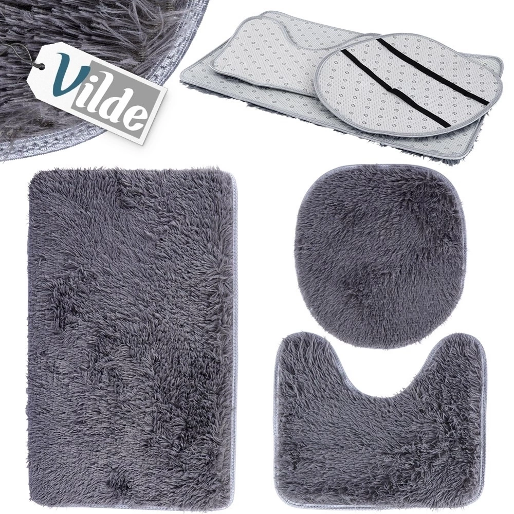 - Zestaw trzech dywaników łazienkowych. W zestawie: dywanik, dywanik z wycięciem oraz nakładka na deskę. Wykonane z miłego w dotyku materiału w szarym kolorze.