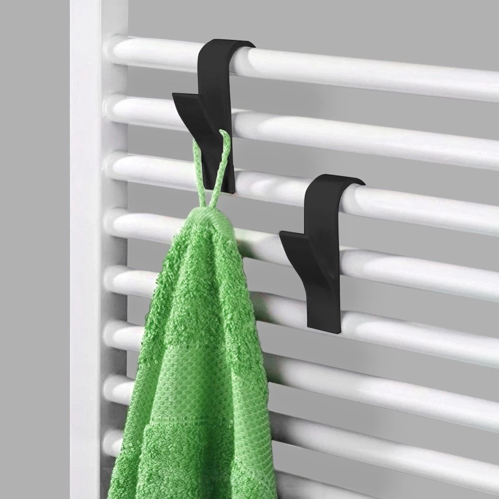 - Zestaw dwóch wieszaków na grzejniki łazienkowe i pokojowe. Idealne do zawieszania ręczników, szlafroków, piżamy, bielizny, szmatek itp. Wykonane z tworzywa w czarnym kolorze.