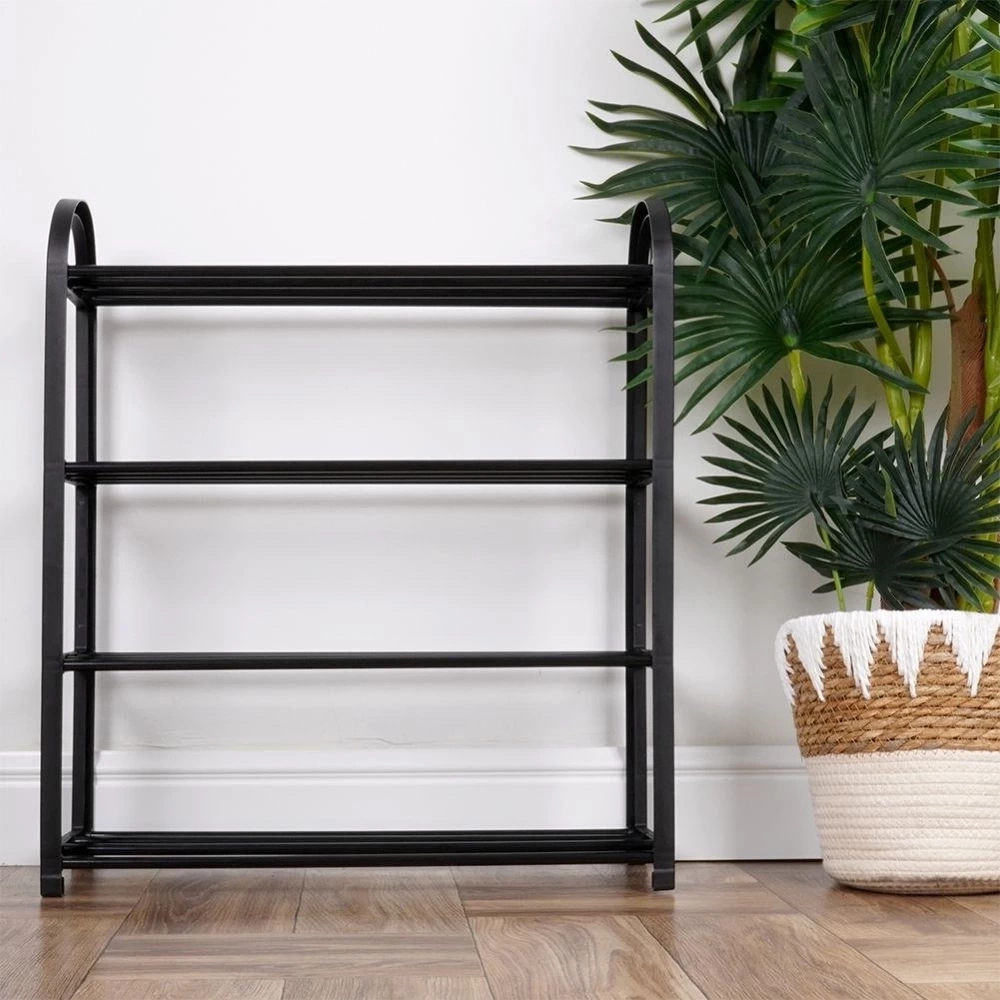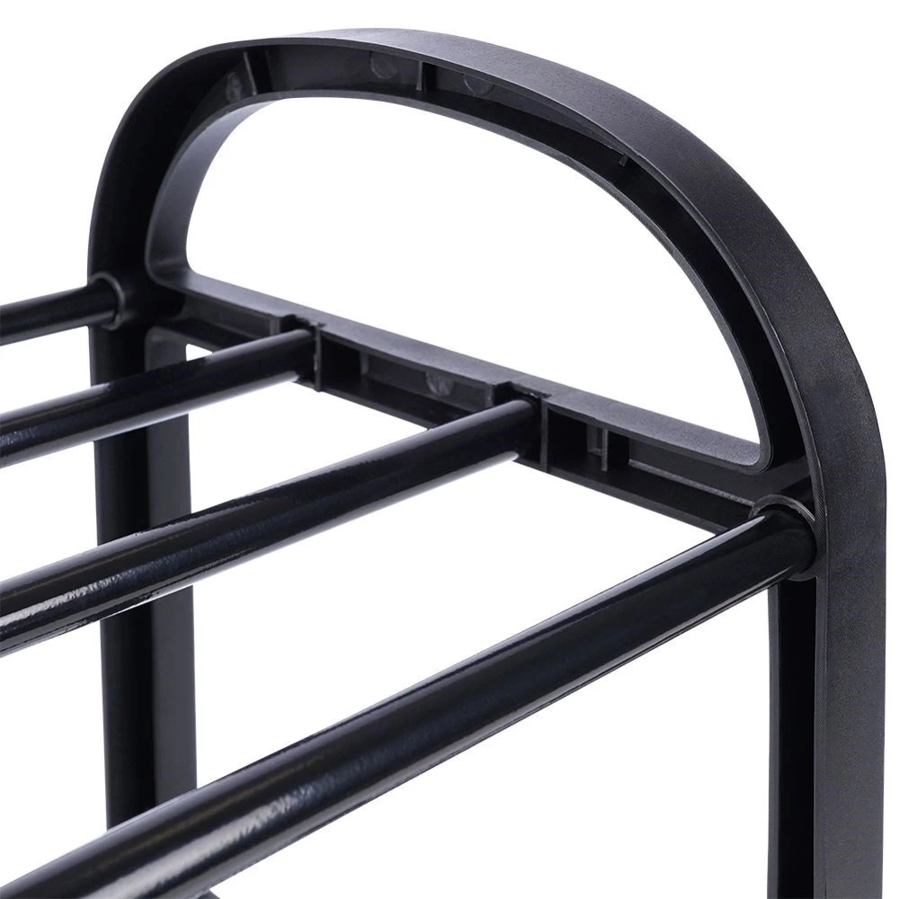 - METALOWY - Konstrukcja regału na buty jest stabilna i wytrzymała. Regał posiada metalowe rurki malowane proszkowo na kolor czarny, boki wykonane są z czarnego tworzywa.