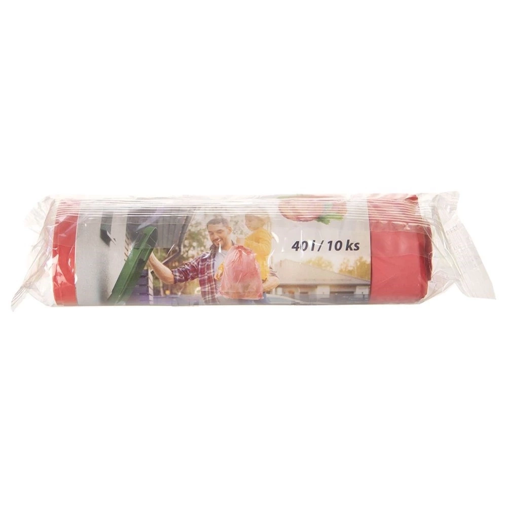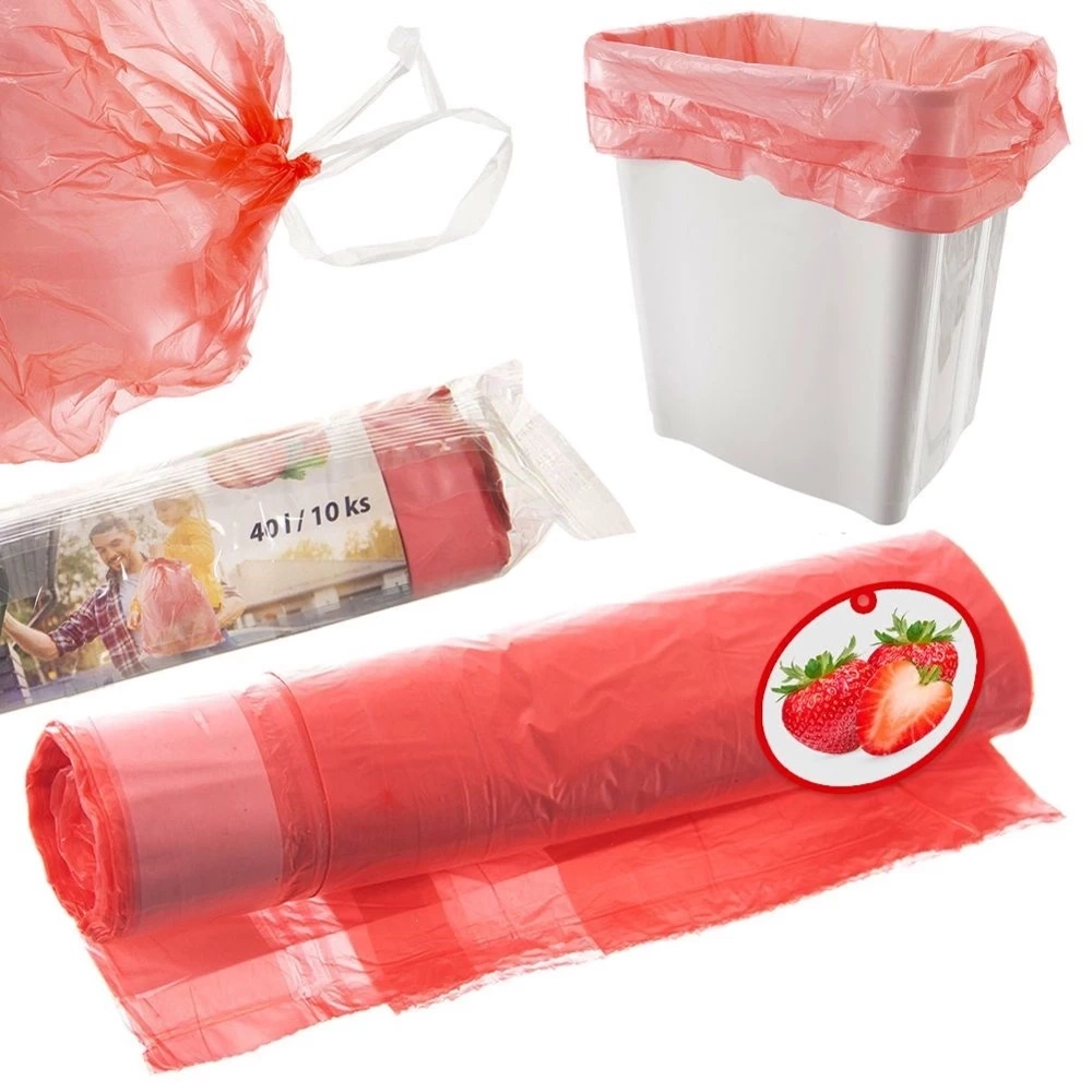 - Zestaw 10 sztuk worków na śmieci o pojemności 40 l. Wykonane z tworzywa HDPE w czerwonym kolorze. Worki mają zapach truskawkowy i są wyposażone w taśmę ściągającą.