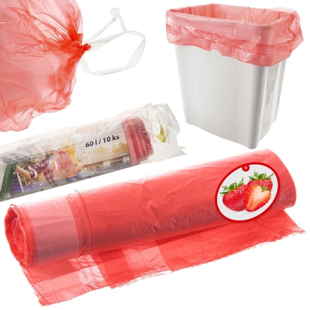 - Zestaw 10 sztuk worków na śmieci o pojemności 60 l. Wykonane z tworzywa HDPE w czerwonym kolorze. Worki mają zapach truskawkowy i są wyposażone w taśmę ściągającą.