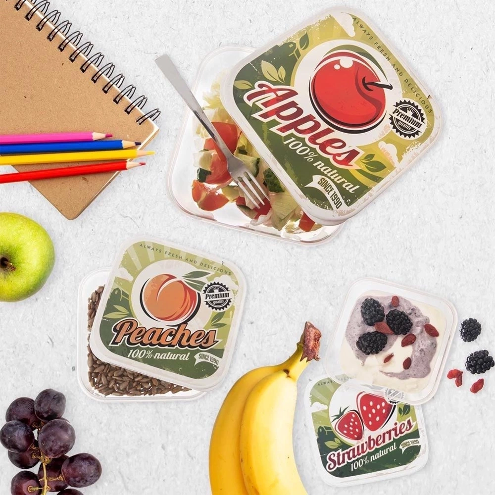 - WYTRZYMAŁE - Wykonane z najwyższej jakości tworzywa w przezroczystym kolorze. Pokrywki są białe i każda posiada inny, kolorowy dekor z motywem owoców. Pojemniki są wytrzymałe, a zarazem lekkie.