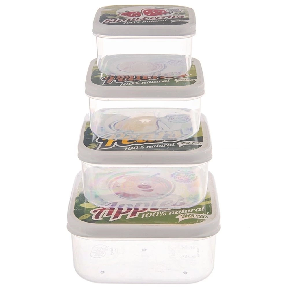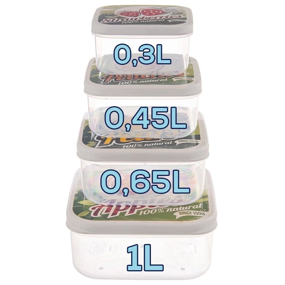 - Zestaw czterech pojemników do przechowywania oraz przenoszenia żywności. Pojemniki posiadają kolorowy dekor z motywem owoców i są w czterech różnych rozmiarach.