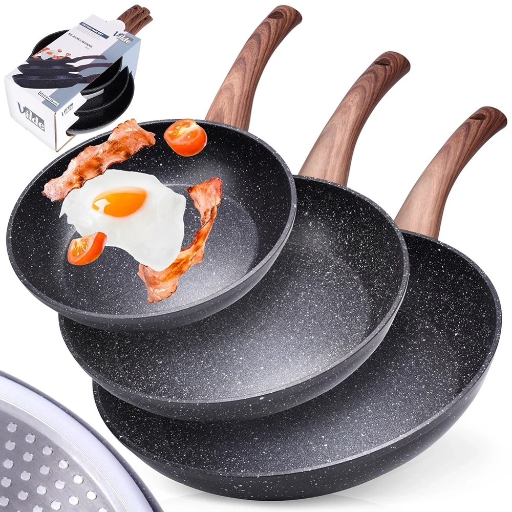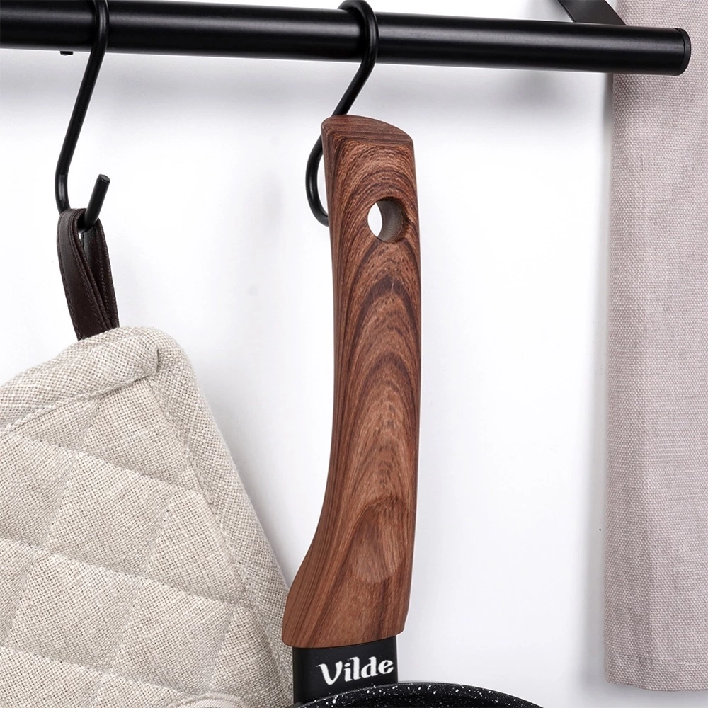 Komplet trzech nieprzywierających patelni o wyjątkowym, ponadczasowym wyglądzie. W zestawie: patelnia o średnicy 20 cm (długość 36,5 cm, wysokość patelni 4,5 cm, wysokość z rączką 6 cm), patelnia o średnicy 24 cm (długość 43 cm, wysokość patelni 5 cm, wysokość z rączką 7 cm) i patelnia o średnicy 28 cm (długość 47 cm, wysokość patelni 5,5 cm, wysokość z rączką 7,5 cm). Patelnie utrzymane w modnym połączeniu czerni z drewnem, dzięki czemu efektownie prezentują się w kuchni. Niezbędne w każdej kuchni. Z ich pomocą usmażymy mięso, warzywa, jak i naleśniki. Wykonane z najwyższej jakości materiałów, odpowiednio użytkowane posłużą długie lata. Oryginalny produkt marki Vilde z linii Black&Wood. Wyprodukowano zgodnie z europejskimi standardami.