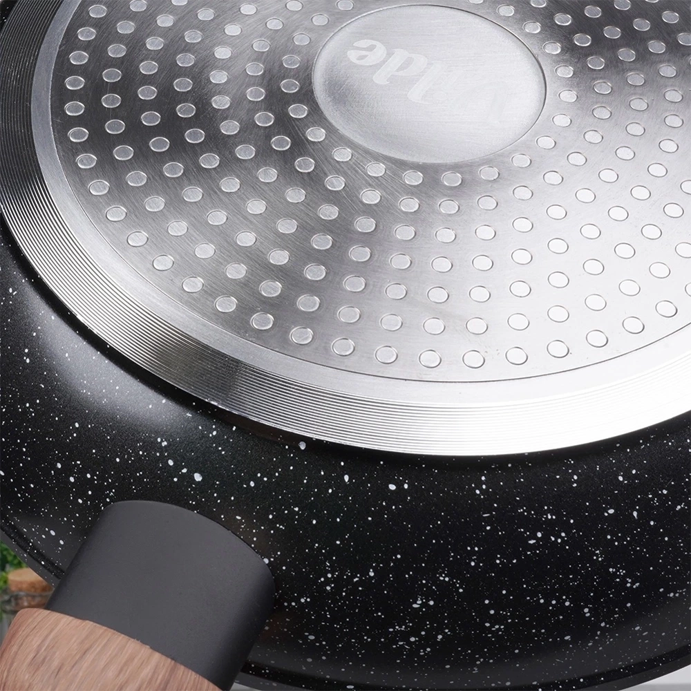 - NIEPRZYWIERAJĄCE - Patelnie wykonane z aluminium z nieprzywierającą powłoką granitową w czarnym kolorze. Powierzchnia nieprzywierająca umożliwia przygotowywanie zdrowych i smacznych posiłków z minimalną ilością tłuszczu. Wyposażone w uchwyty wykonane z najwyższej jakości, wytrzymałego tworzywa imitującego drewno.