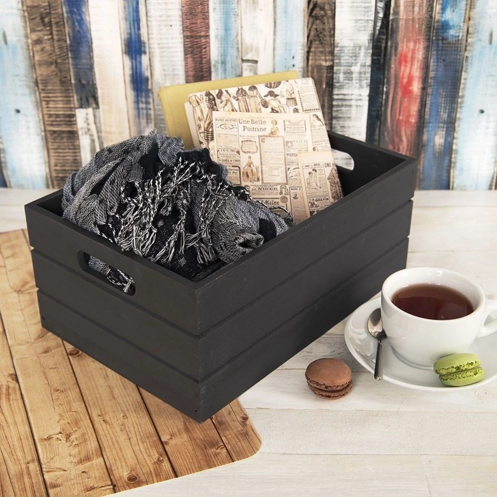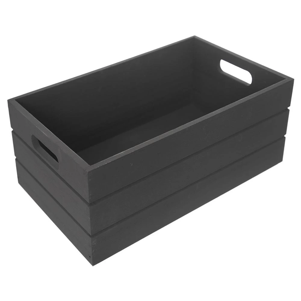 - DREWNIANA - Wykonana w całości z wytrzymałego drewna, malowana na czarny kolor. Skrzynka posiada prostokątny kształt i dwa otwory po bokach dla łatwiejszego przenoszenia.