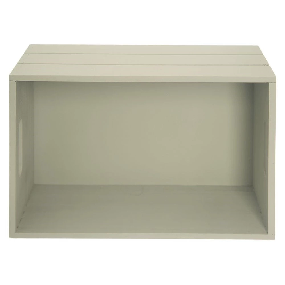 - DREWNIANA - Wykonana w całości z wytrzymałego drewna, malowana na pastelowy, jasnozielony kolor. Skrzynka posiada prostokątny kształt i dwa otwory po bokach dla łatwiejszego przenoszenia.