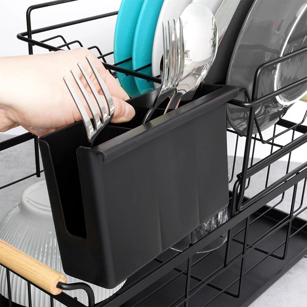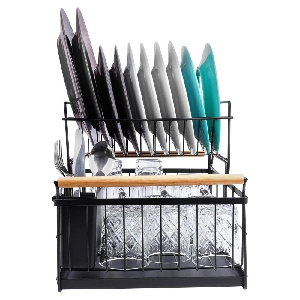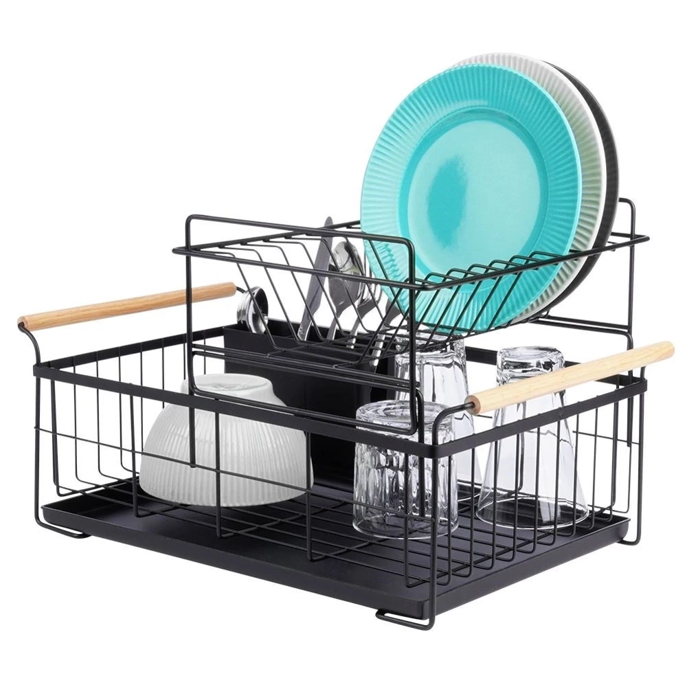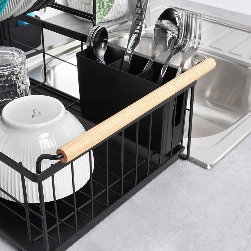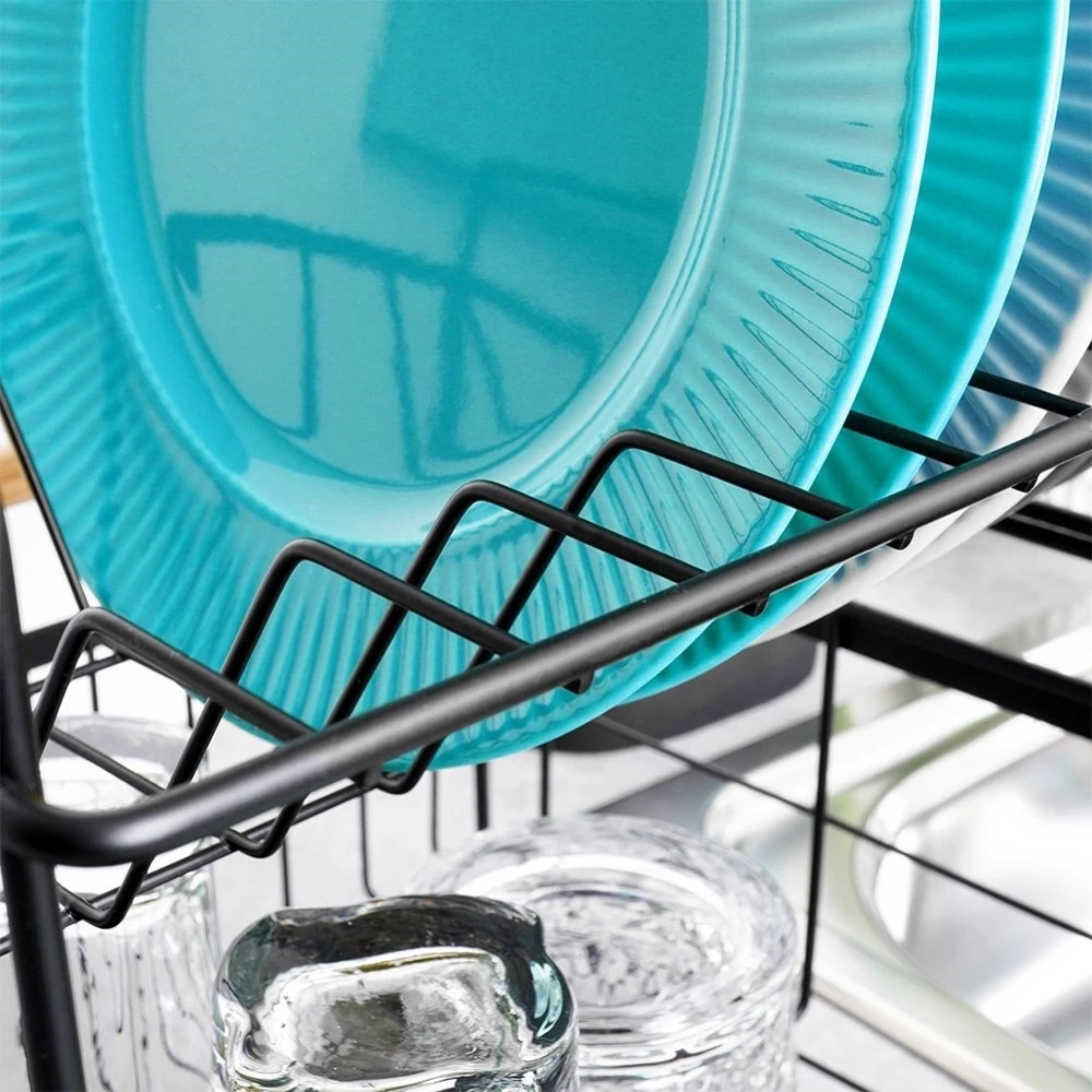 - Elegancka, dwupoziomowa suszarka do naczyń w kolorze czarnym z bambusowymi uchwytami. Posiada miejsce na talerze, szklanki oraz ociekacz na sztućce. Wyposażona w tacę ociekową.