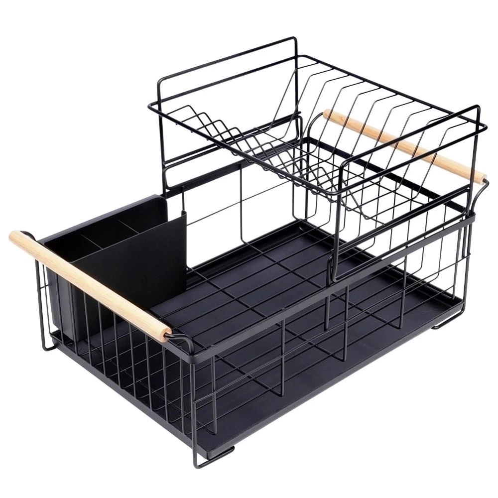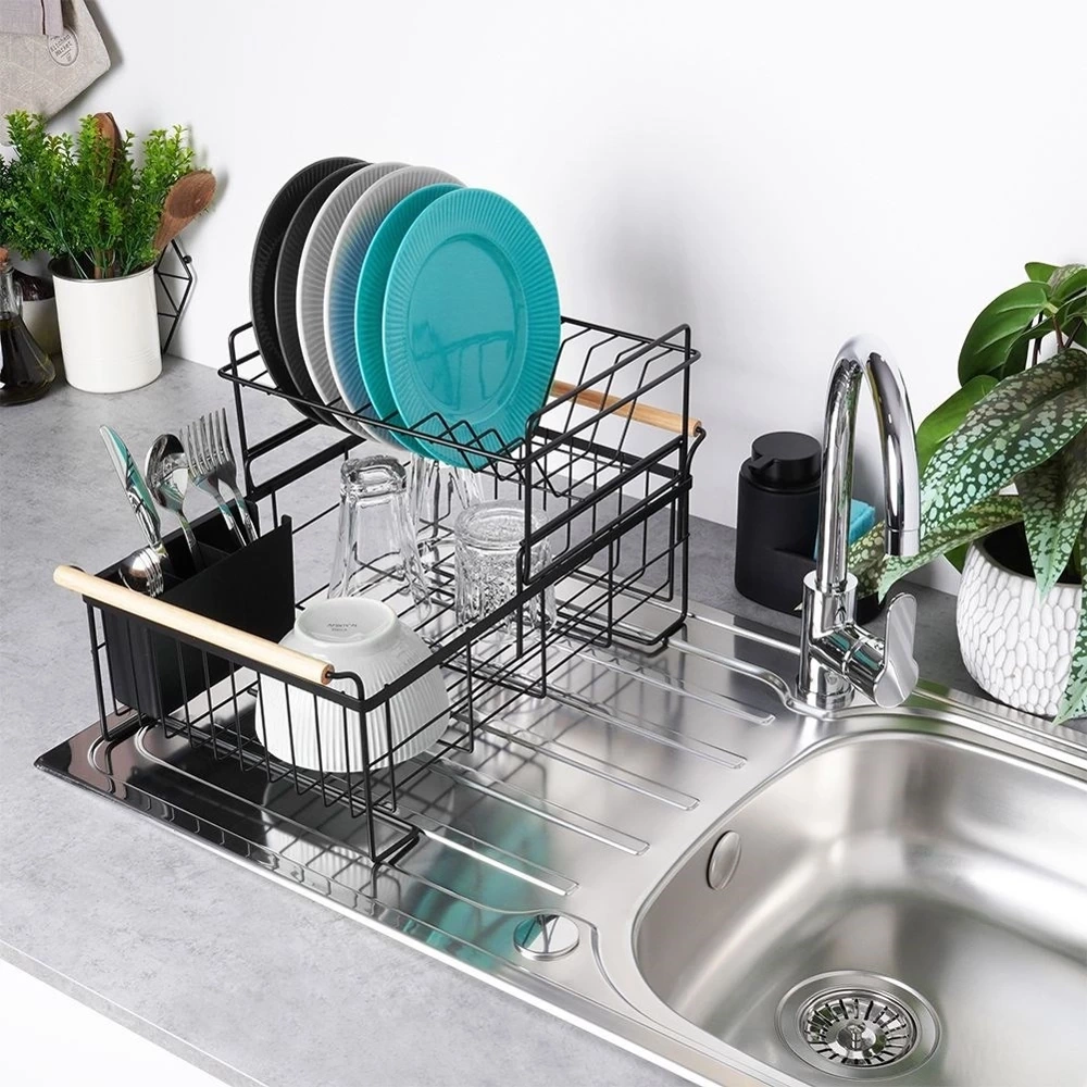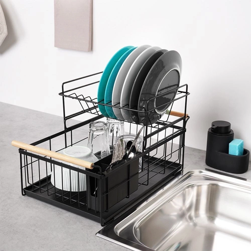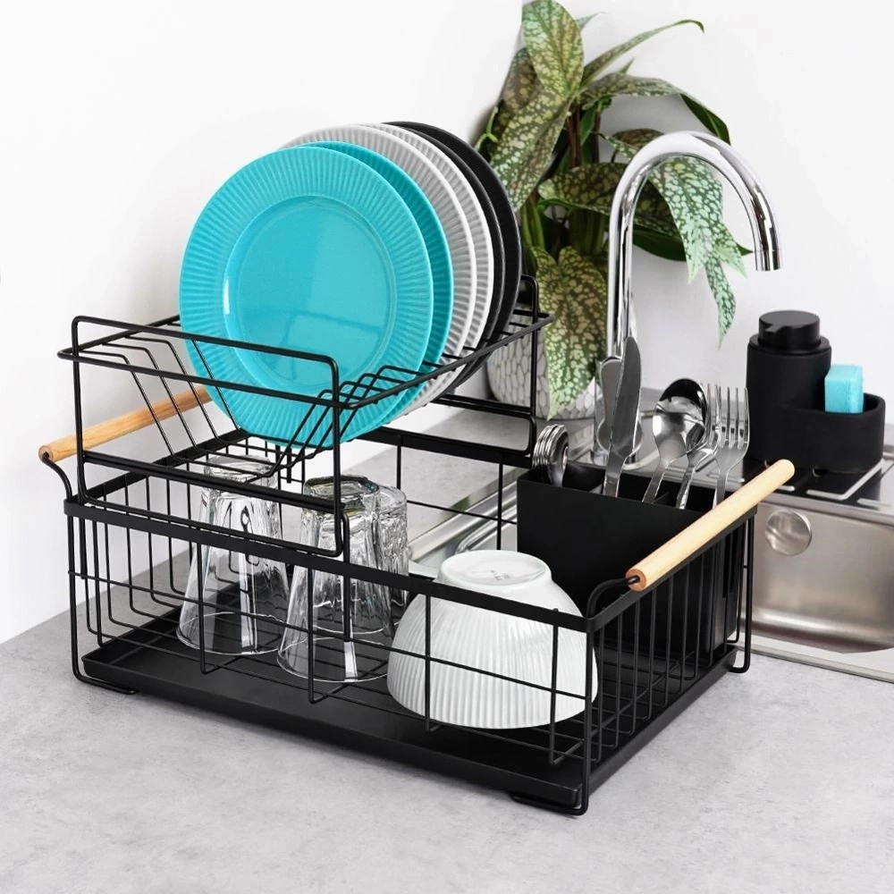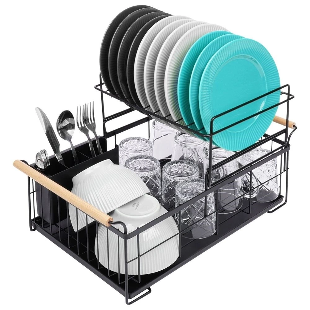 - Elegancka, dwupoziomowa suszarka do naczyń w kolorze czarnym z bambusowymi uchwytami. Posiada miejsce na talerze, szklanki oraz ociekacz na sztućce. Wyposażona w tacę ociekową.