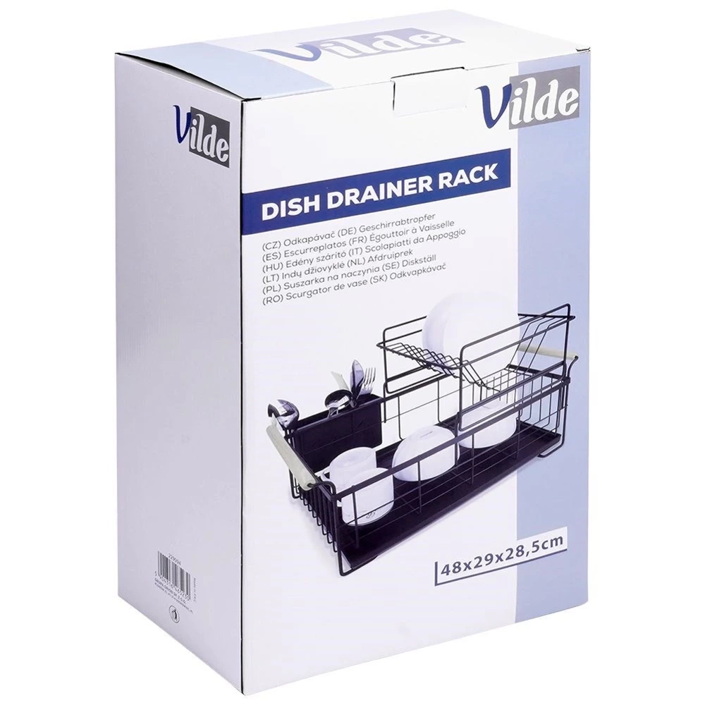 Dwupoziomowa, kompaktowa suszarka na naczynia z miejscem na talerze, sztućce oraz inne naczynia. Wykonana z wytrzymałych materiałów. Dzięki niej zapomnisz o nieuporządkowanych naczyniach i mokrych śladach na blacie szafek przy zlewie. Suszarka pozwala na równoczesne suszenie naczyń na dwóch różnych poziomach. Jest niezwykle pojemna, gdyż posiada miejsce na talerze, kubki, sztućce, a także inne naczynia. Dodatkowo, posiada wyjmowaną tacę ociekową, dzięki czemu utrzymanie jej w czystości nie stanowi problemu. Oryginalny produkt marki Vilde. Wyprodukowano zgodnie z europejskimi standardami.