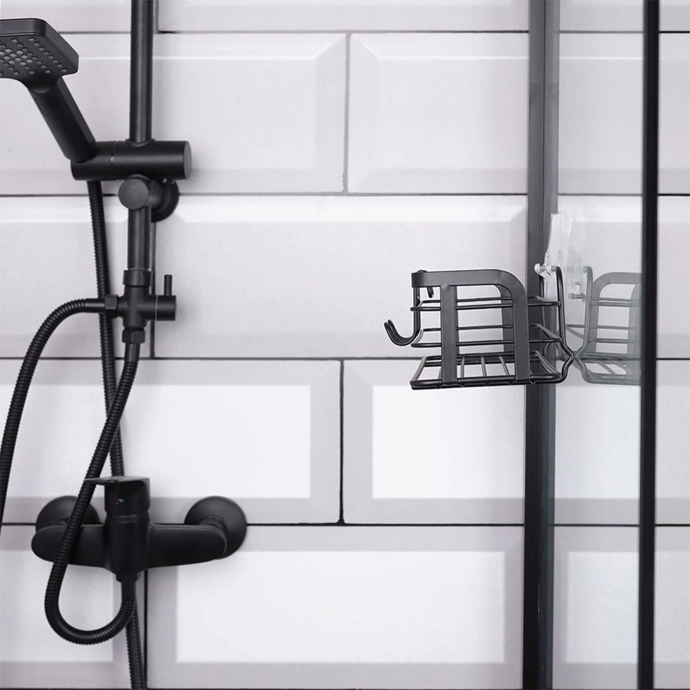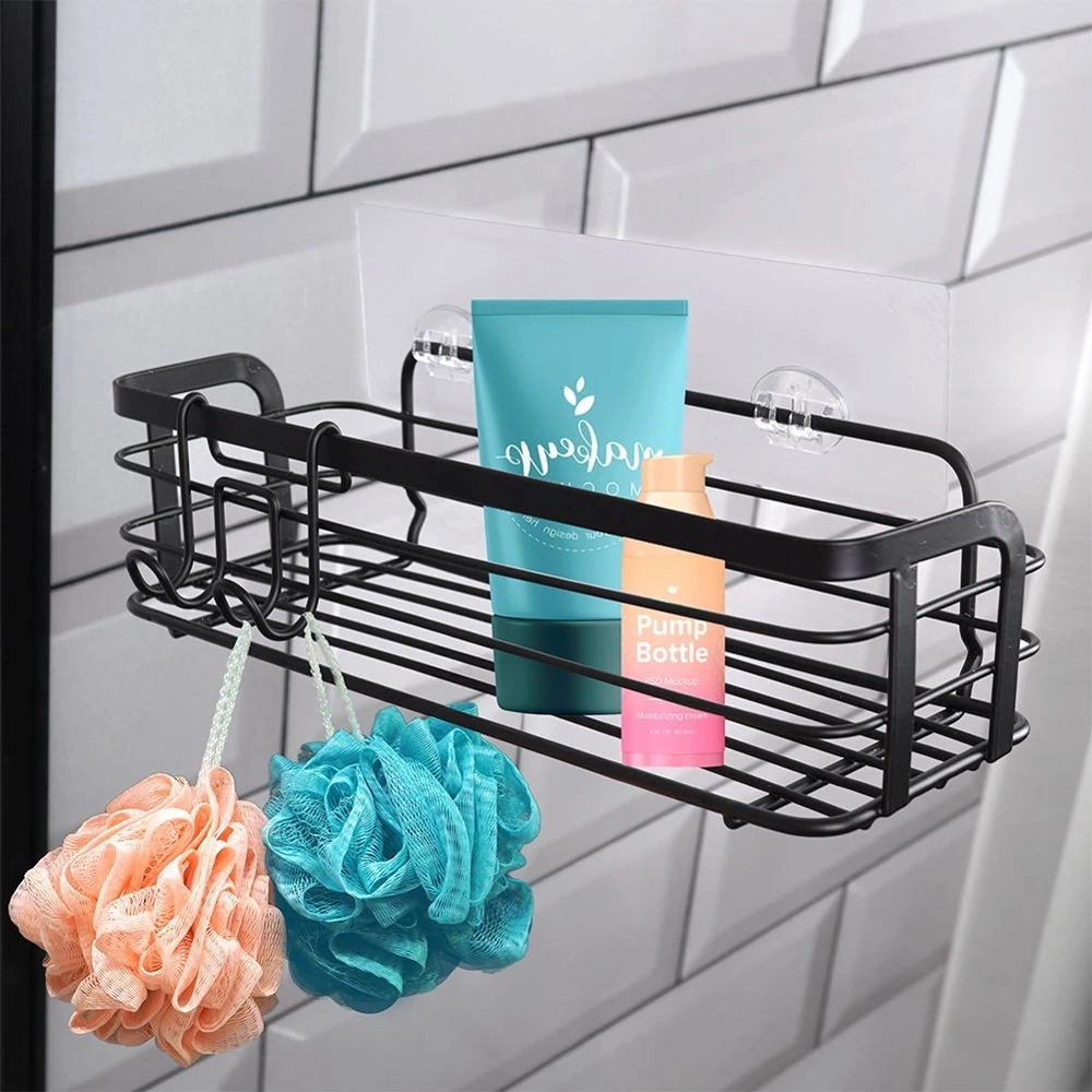 - Półka łazienkowa przyklejana za pomocą mocnej taśmy. Wykonana z metalu w czarnym kolorze. Idealna do montażu pod prysznicem tak, aby kosmetyki były zawsze pod ręką.