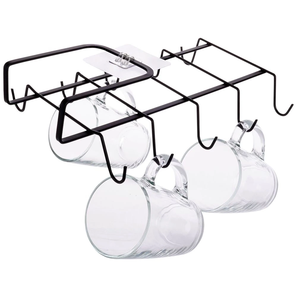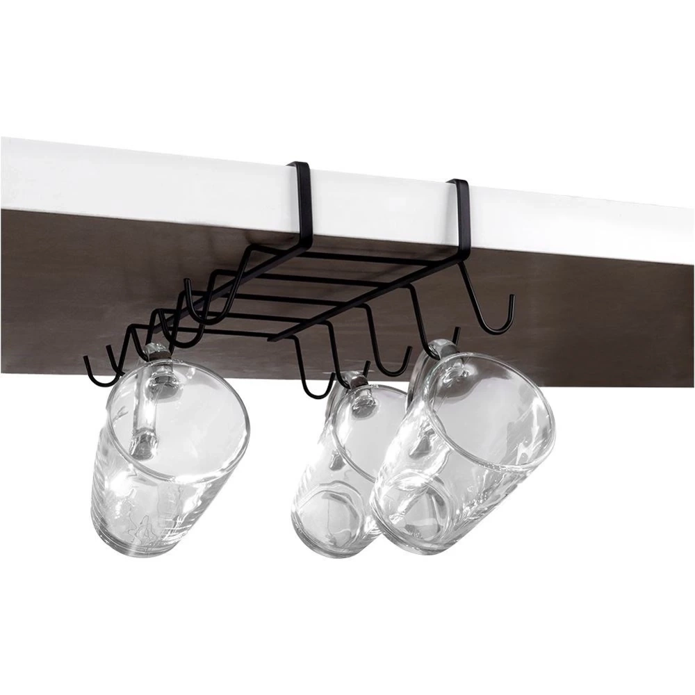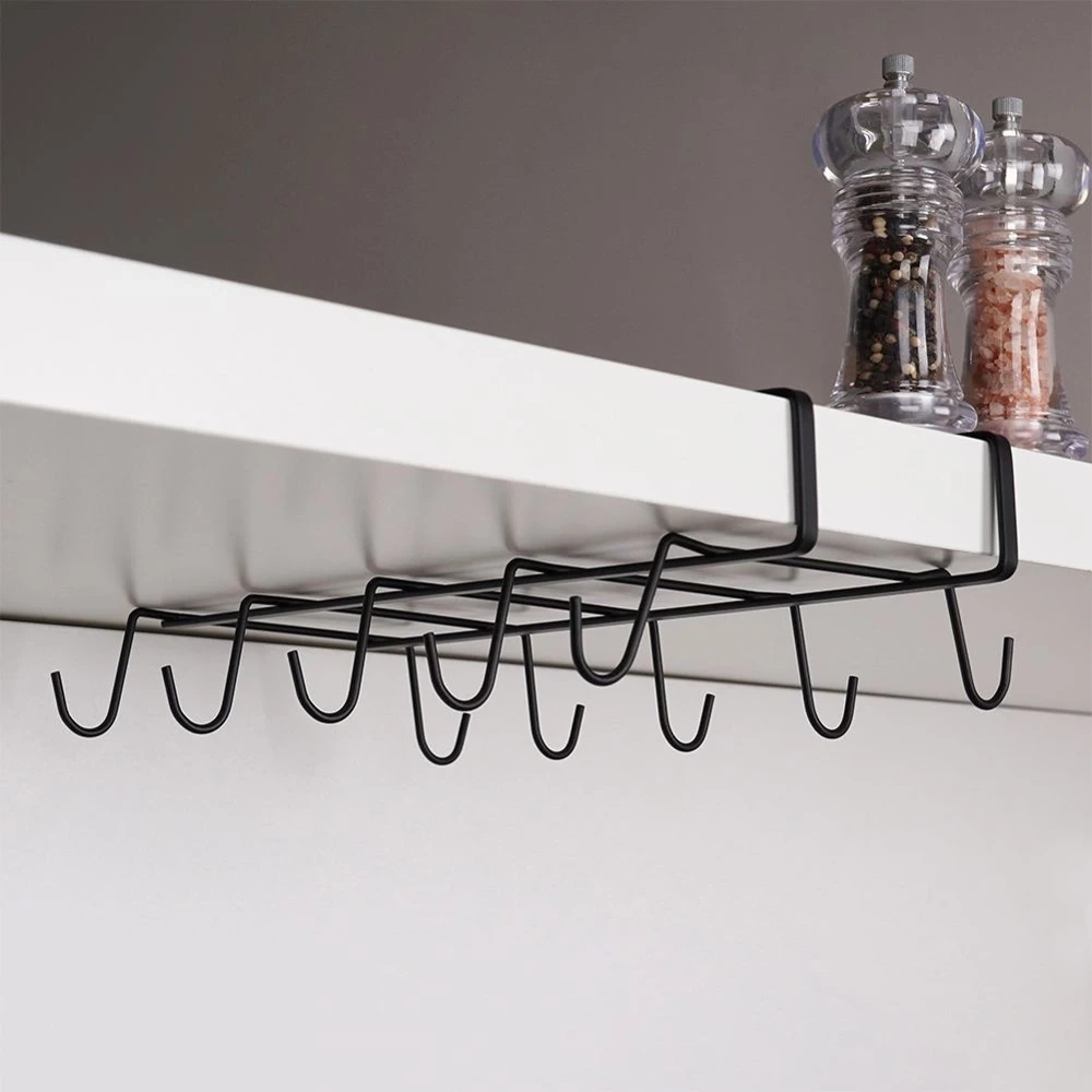 - Praktyczny wieszak kuchenny na kubki lub filiżanki. Wykonany z metalu w czarnym kolorze. Nie wymaga wiercenia, montowany do górnych szafek kuchennych.