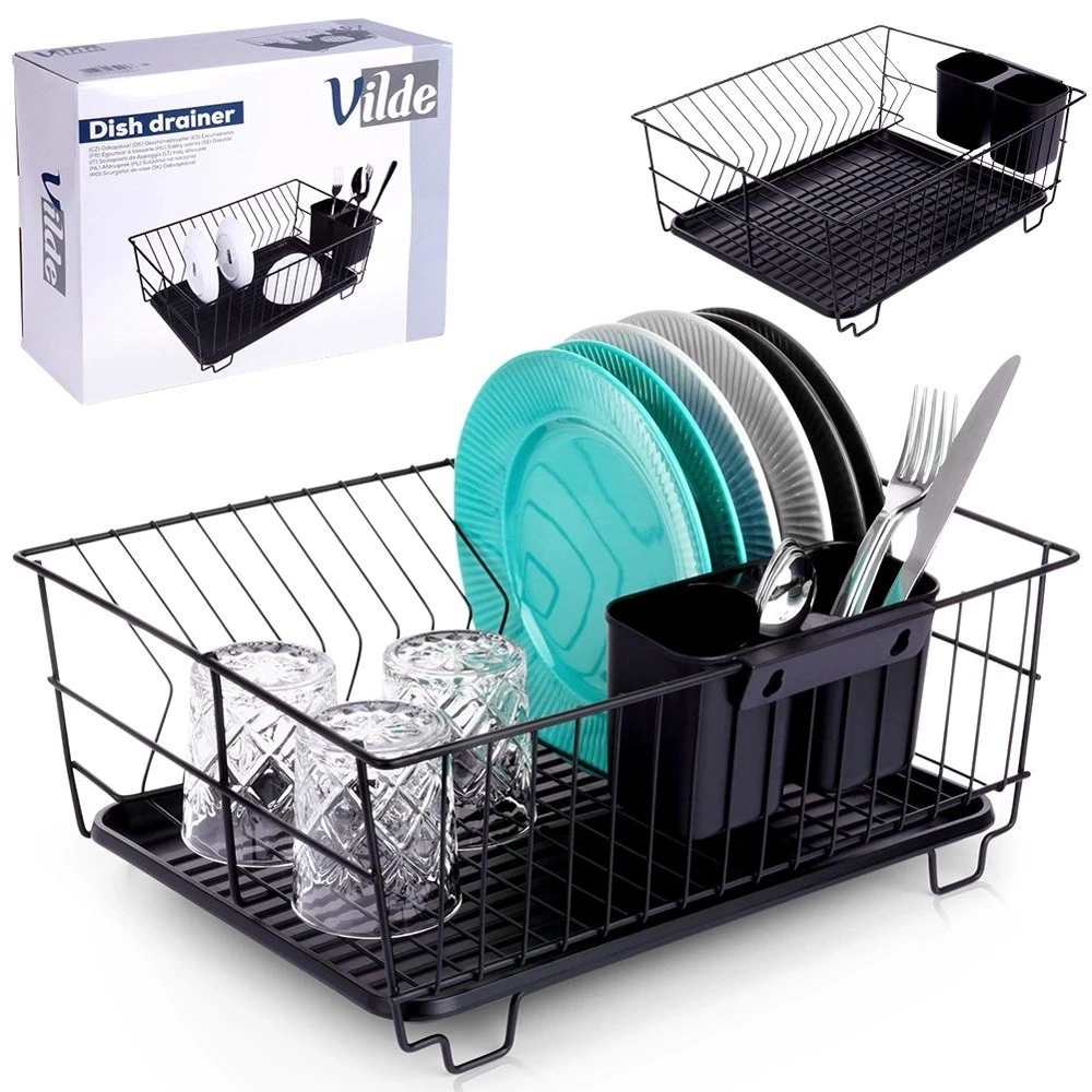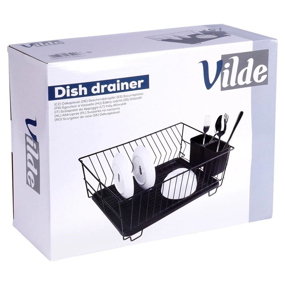 Kompaktowa suszarka na naczynia z miejscem na talerze oraz sztućce. Wykonana z wytrzymałych materiałów. Dzięki niej zapomnisz o nieuporządkowanych naczyniach i mokrych śladach na blacie szafek przy zlewie. Suszarka to niezbędny element wyposażenia kuchni. Wykonana w eleganckim stylu, a zarazem funkcjonalna. Łatwa w czyszczeniu. Posiada wyjmowaną tacę ociekową, dzięki czemu utrzymanie jej w czystości nie stanowi problemu. Oryginalny produkt marki Vilde. Wyprodukowano zgodnie z europejskimi standardami.