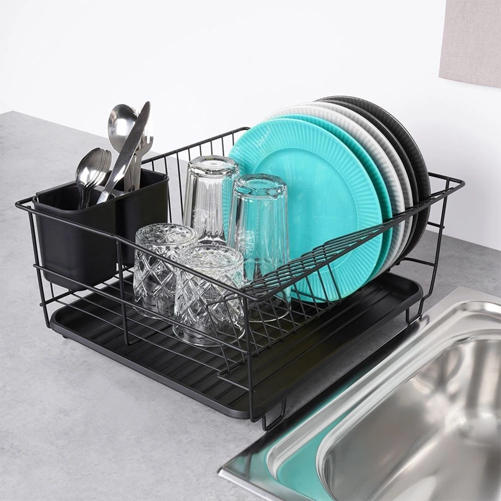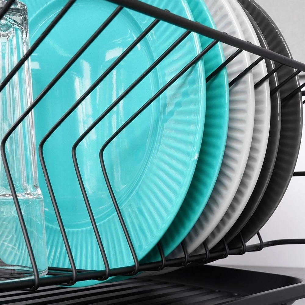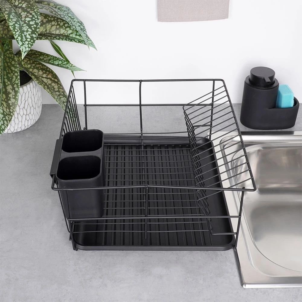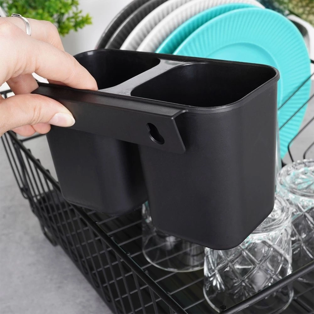 - Elegancka suszarka do naczyń w kolorze czarnym. Posiada miejsce na talerze, szklanki oraz ociekacz sztućce. Wyposażona w wyjmowaną tacę ociekową.