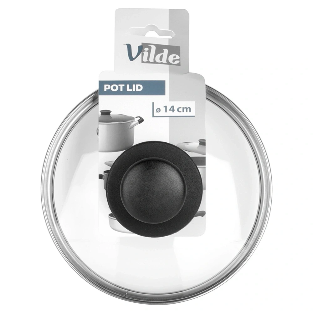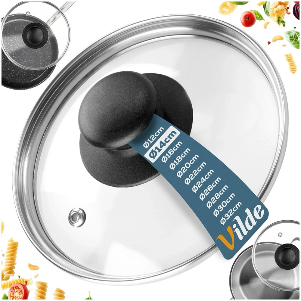 Uniwersalna pokrywka szklana, idealne pasująca do naczyń, patelni i garnków o średnicy 14 cm. Wykonana z wytrzymałych i solidnych materiałów. Będzie świetnym uzupełnieniem garnka lub patelni, które pokrywki w zestawie nie posiadały. Klasyczny kształt zapewni wygodne użytkowanie. Pokrywka jest niezbędna w każdej kuchni. Dzięki niej potrawy szybciej się gotują, a także zabezpiecza przed pryskaniem wody i tłuszczu. Dodatkowo, pokrywka sprawia, że przygotowane potrawy dłużej utrzymują temperaturę. Oryginalny produkt marki Vilde. Wyprodukowano zgodnie z europejskimi standardami.