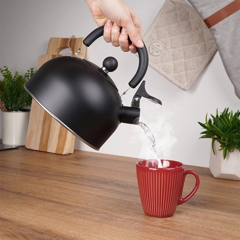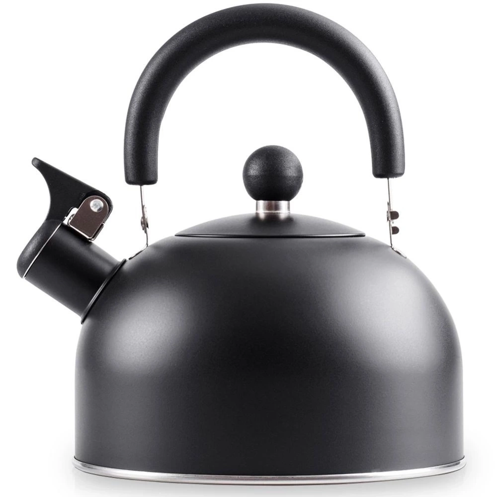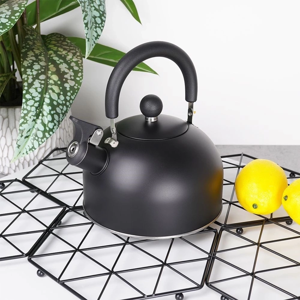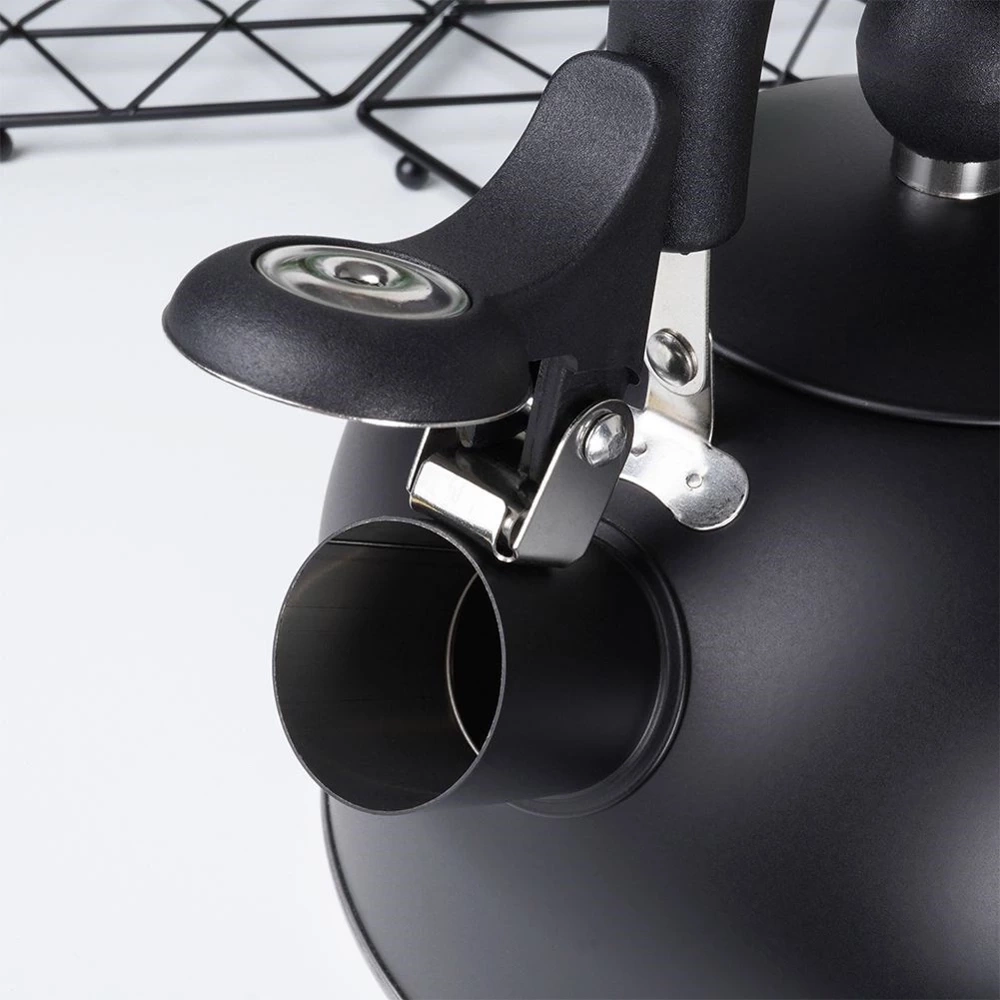 - Czajnik z uchylnym gwizdkiem. Wykonany ze stali nierdzewnej w matowym, czarnym kolorze. Do stosowania na wszystkich rodzajach kuchenek.