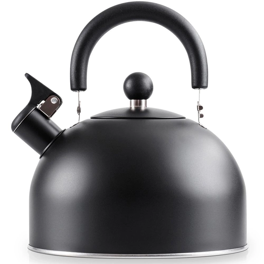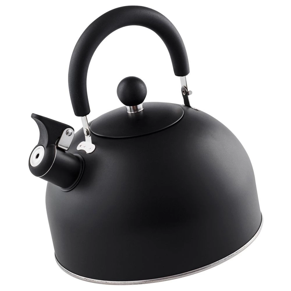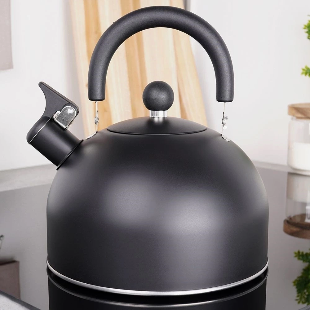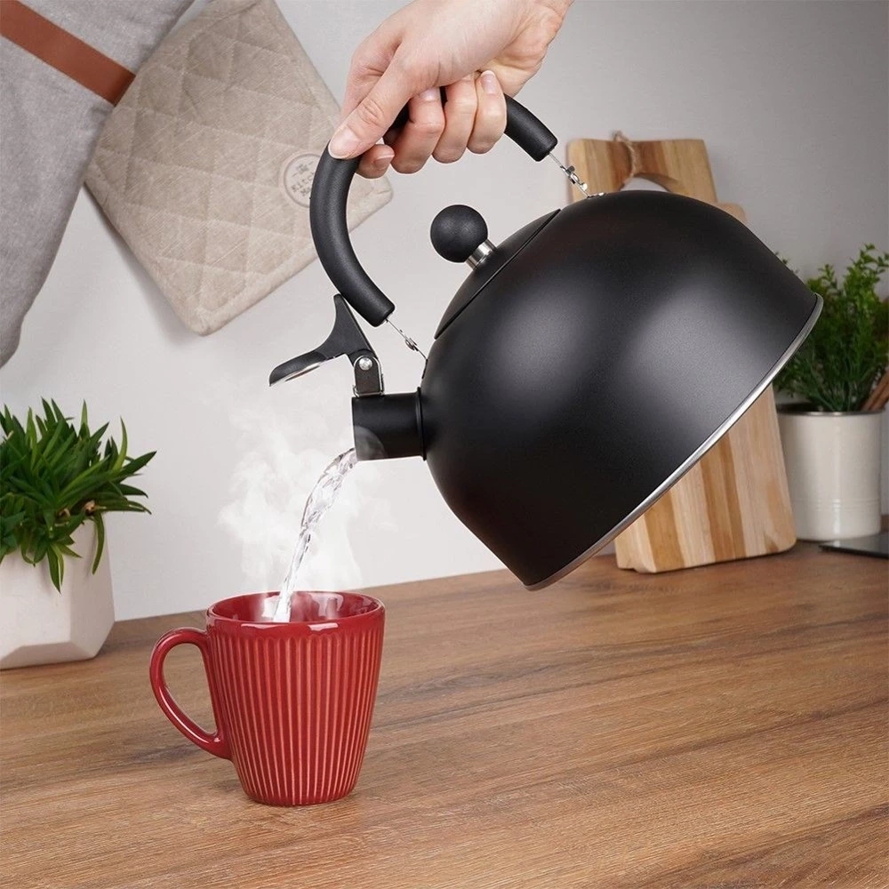 - Czajnik z uchylnym gwizdkiem. Wykonany ze stali nierdzewnej w matowym, czarnym kolorze. Do stosowania na wszystkich rodzajach kuchenek.