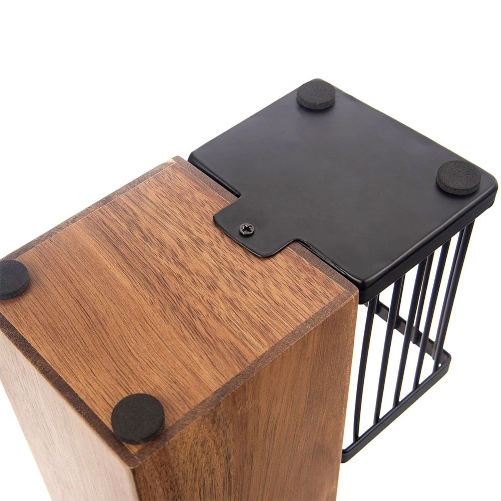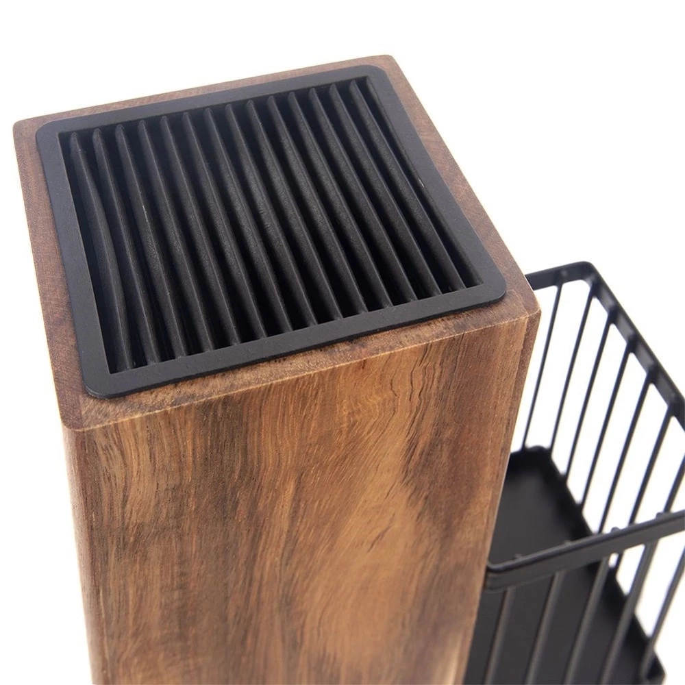 - SOLIDNY - Stojak wykonany z drewna akacjowego, posiada wewnątrz wkładkę na noże wykonaną z tworzywa w kolorze czarnym. Stojak posiada również metalowy koszyk w kolorze czarnym, w którym możemy umieścić najpotrzebniejsze przybory kuchenne. Na spodzie znajdują się cztery filcowe podkładki, które zabezpieczą blat i sprawią, że stojak jest antypoślizgowy.