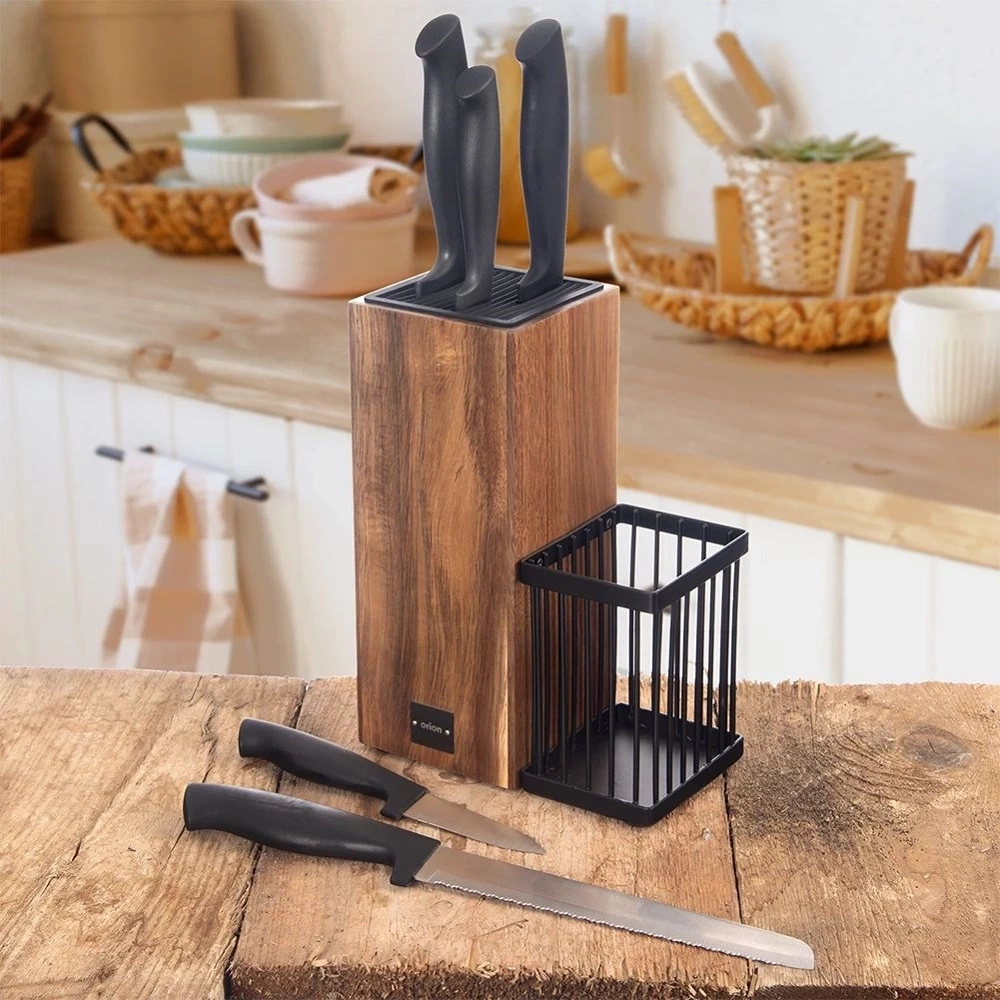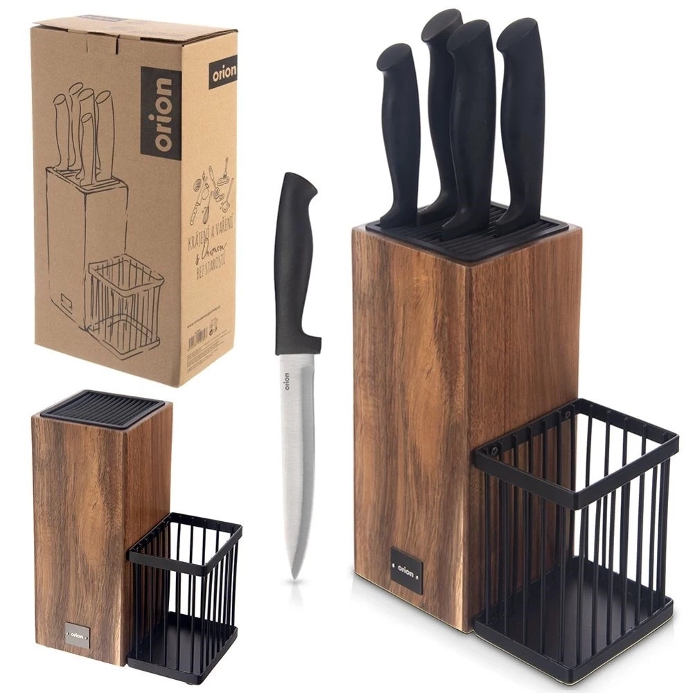 - Stojak na noże i przybory kuchenne w zestawie z 5 nożami. Noże wykonane ze stali nierdzewnej z antypoślizgową rękojeścią a stojak z drewna akacjowego. Idealny pomysł na prezent.