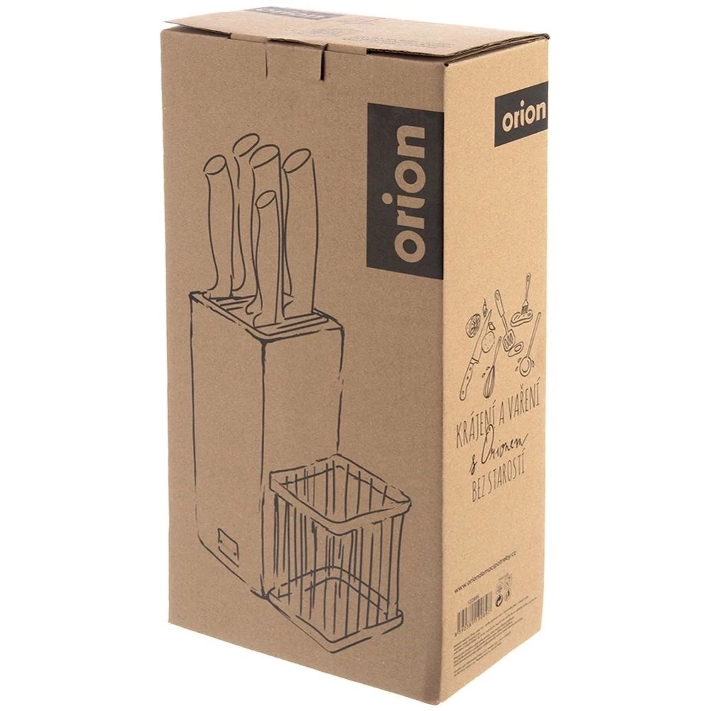Stojak na noże i przybory kuchenne w zestawie wraz z nożami. Przydatny w każdej kuchni. Noże pozwalają na precyzyjne krojenie i efektywne przygotowywanie potraw. W zestawie: nóż do obierania (długość całkowita 18,5 cm, długość ostrza 7,5 cm, szerokość ostrza 2 cm), nóż uniwersalny mały (długość całkowita 23,5 cm, długość ostrza 12,5 cm, szerokość ostrza 2 cm), nóż uniwersalny średni (długość całkowita 27 cm, długość ostrza 15 cm, szerokość ostrza 3 cm), nóż uniwersalny duży (długość całkowita 33 cm, długość ostrza 20,5 cm, szerokość ostrza 4 cm), nóż do pieczywa (długość całkowita 30 cm, długość ostrza 17,5 cm, szerokość ostrza 2,5 cm). Solidnie wykonane z wytrzymałych materiałów. Noże będą przydatne podczas różnych prac w kuchni, a stojak sprawdzi się do ich przechowywania. Modny a zarazem klasyczny wygląd sprawia, że zestaw wpasuje się do każdej kuchni. Zestaw jest świetnym pomysłem na prezent dla bliskich np. z okazji parapetówki. Oryginalny produkt czeskiej marki Orion. Wyprodukowano zgodnie z europejskimi standardami.