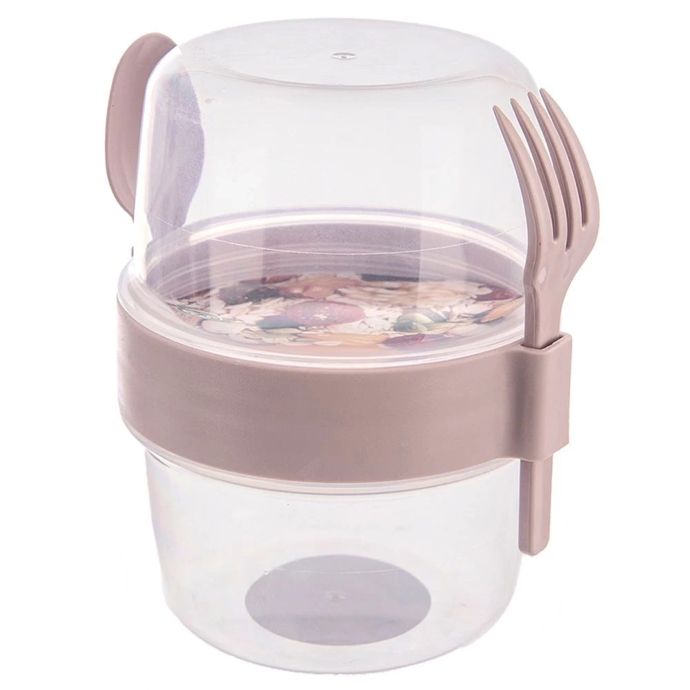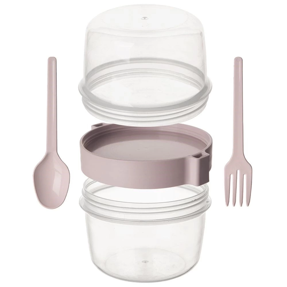 - Pojemnik na jogurt z pokrywką, miseczką na płatki/musli oraz łyżeczką i widelczykiem. Świetnie sprawdzi się na sałatki. Idealny do pracy, szkoły czy na pikniki.