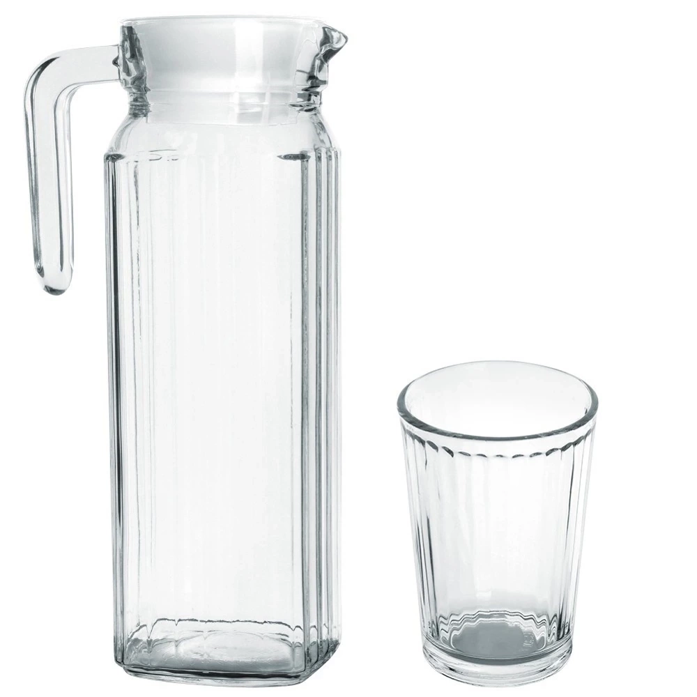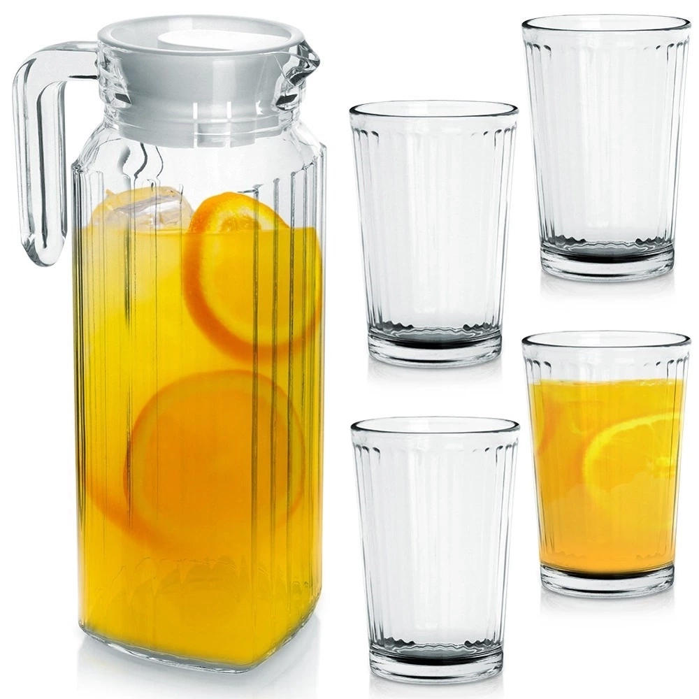 Zestaw składający się z czterech szklanek oraz dzbanka wraz z pokrywką. Idealny zestaw do przygotowania i serwowania napojów, soków, lemoniad oraz wody. Zestaw świetnie sprawdzi się podczas spędzania czasu w ogrodzie, gdyż dzbanek jest wyposażony w pokrywkę, która ochroni nasz napój przed owadami. Wyprodukowano zgodnie z europejskimi standardami.