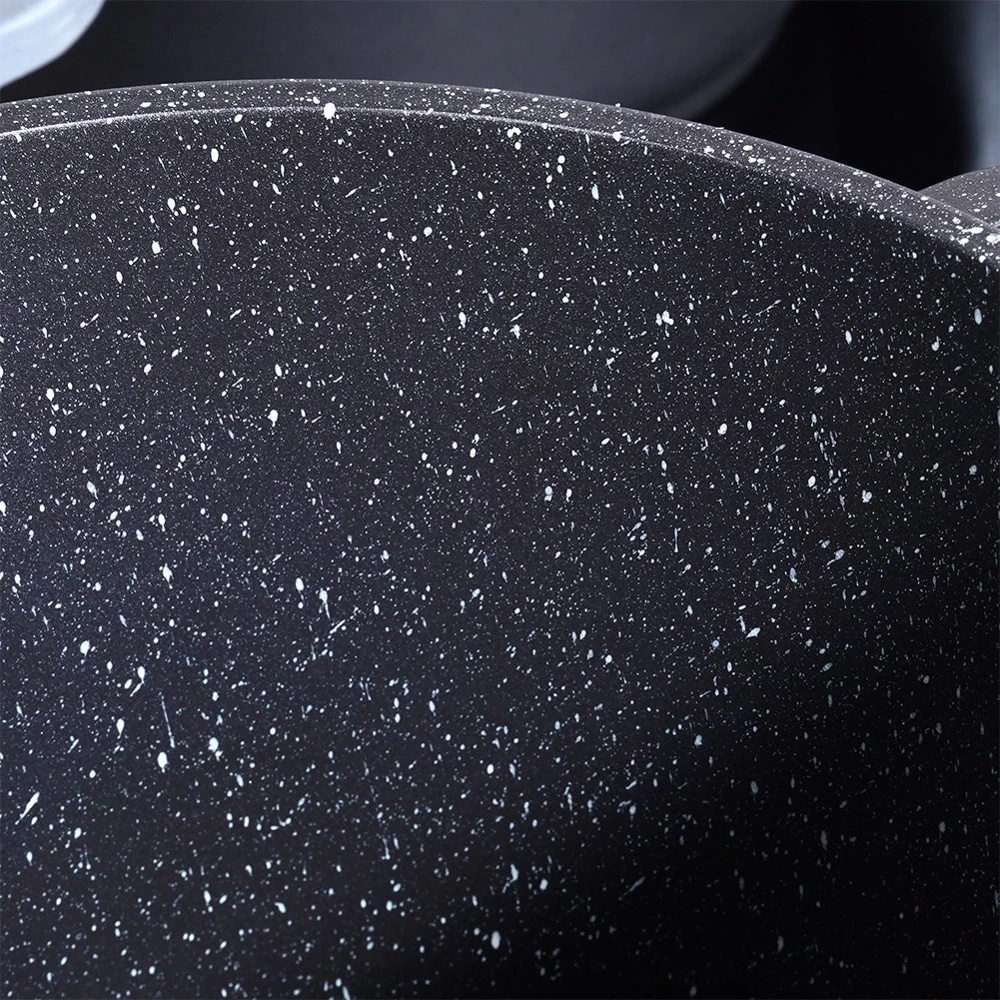- WYSOKI - Garnek o średnicy 25 cm i pojemności 7,6 l z pokrywką. Garnek wykonany z aluminium w czarnym kolorze, wewnątrz posiada nieprzywierającą powłokę granitową. Wyposażony w pokrywkę wykonaną ze szkła i stali nierdzewnej. Wymiary zewnętrzne garnka: 32 x 25 x 20 cm, wysokość z pokrywką wynosi 25 cm.