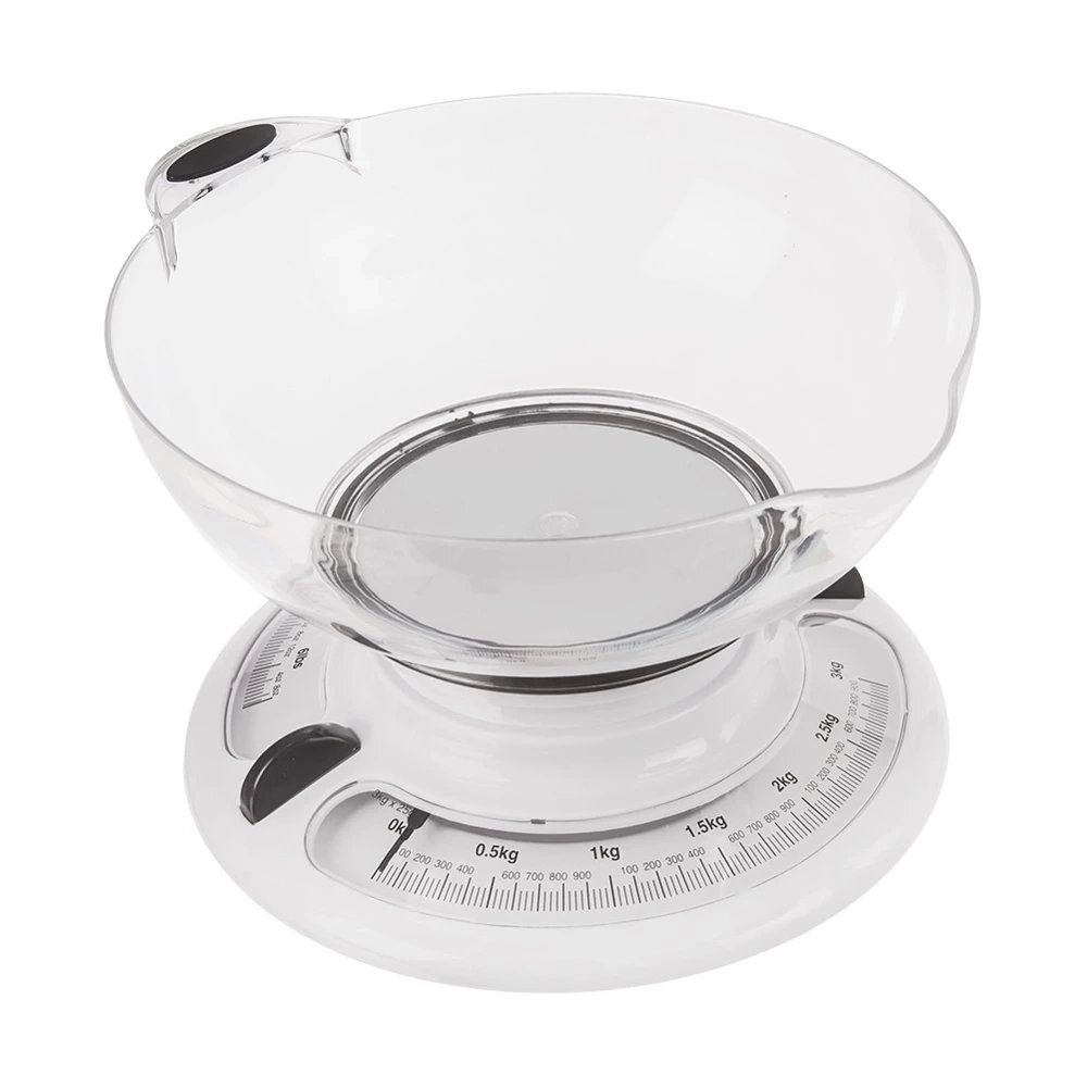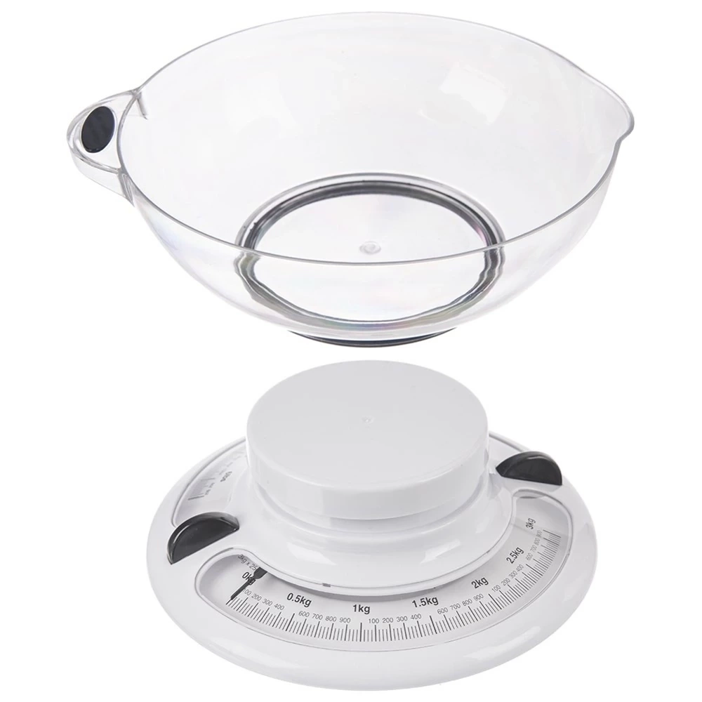 - Mechaniczna waga kuchenna ze zdejmowaną miską. Zakres wagi wynosi 3 kg. Posiada skalę w kg/g oraz lbs/oz. Niezbędna w każdej kuchni.