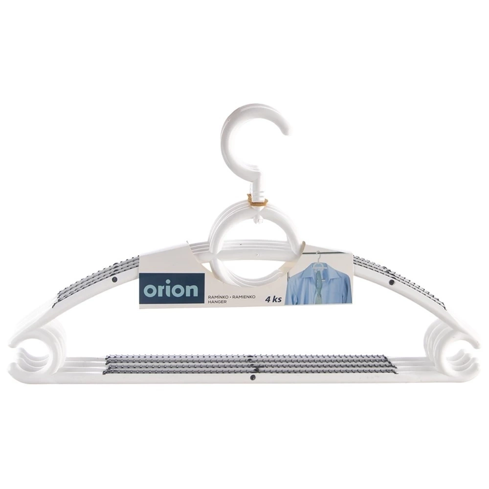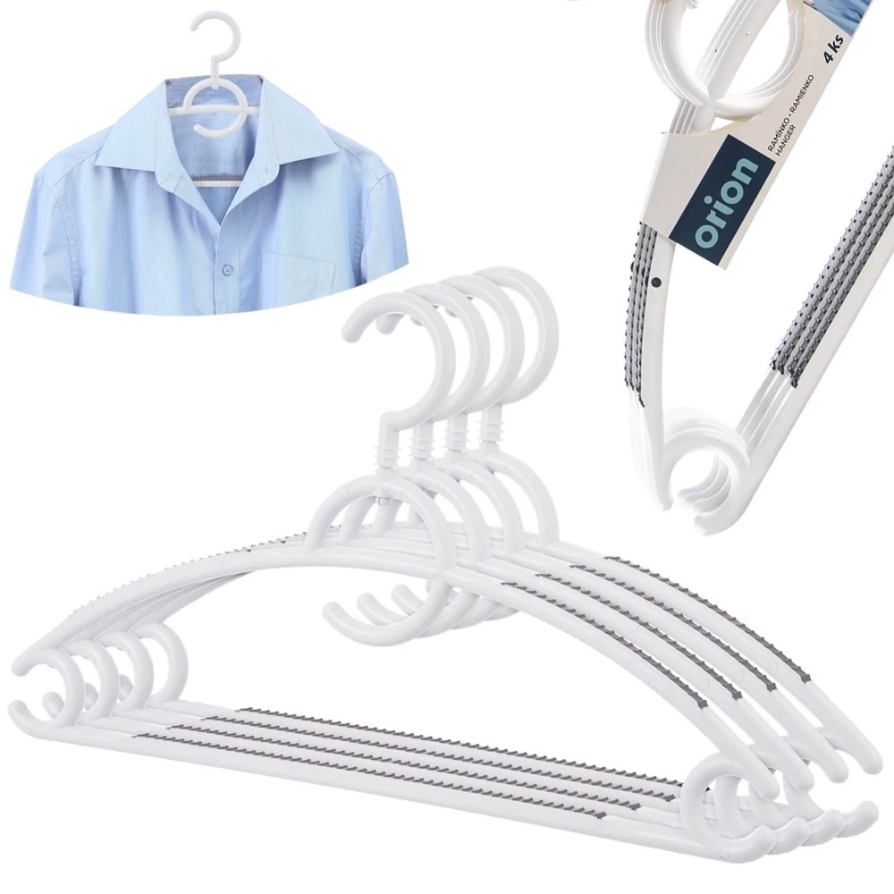 Zestaw czterech wieszaków na ubrania o uniwersalnym zastosowaniu, posiadają antypoślizgowe elementy, które doskonale trzymają odzież. Można wykorzystać je do przechowywania różnych rodzajów ubrań. Posiadają miejsca do zawieszenia dodatkowej garderoby. Wieszaki wykorzystamy w każdym domu, ale również w sklepie. Dzięki nim możesz skutecznie zorganizować przestrzeń w szafie i utrzymać porządek. Oryginalny produkt czeskiej marki Orion. Wyprodukowano zgodnie z europejskimi standardami.