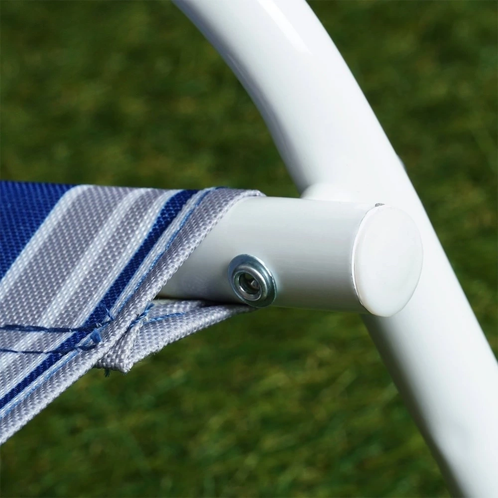 - METALOWE - Konstrukcja krzesła jest lekka a jednocześnie wytrzymała, wykonana z metalu w kolorze białym. Siedzisko wykonane z odpornej tkaniny poliestrowej w odcieniach niebieskiego.