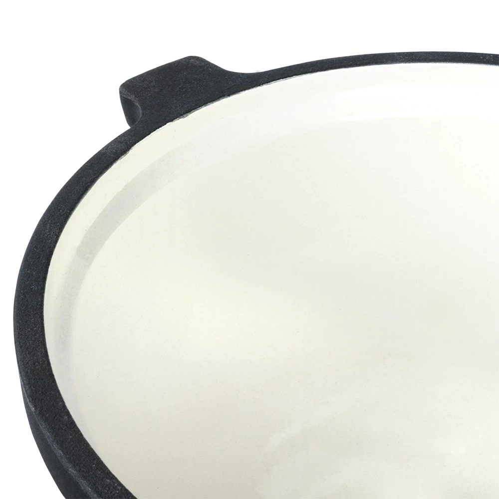 - ŻELIWNY Z EMALIOWANYM ŚRODKIEM - Garnek i pokrywka wykonane są w całości z odlewu żeliwa w czarnym kolorze. Środek kociołka posiada emaliowaną powłokę w kolorze beżowym. Kociołek jest ciężki, wytrzymały i odporny na wysokie temperatury. Długo utrzymuje temperaturę oraz równomiernie ją rozprowadza, co sprawia, że potrawy gotują się szybciej.