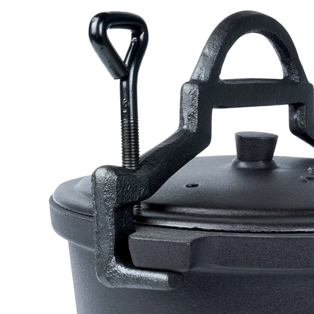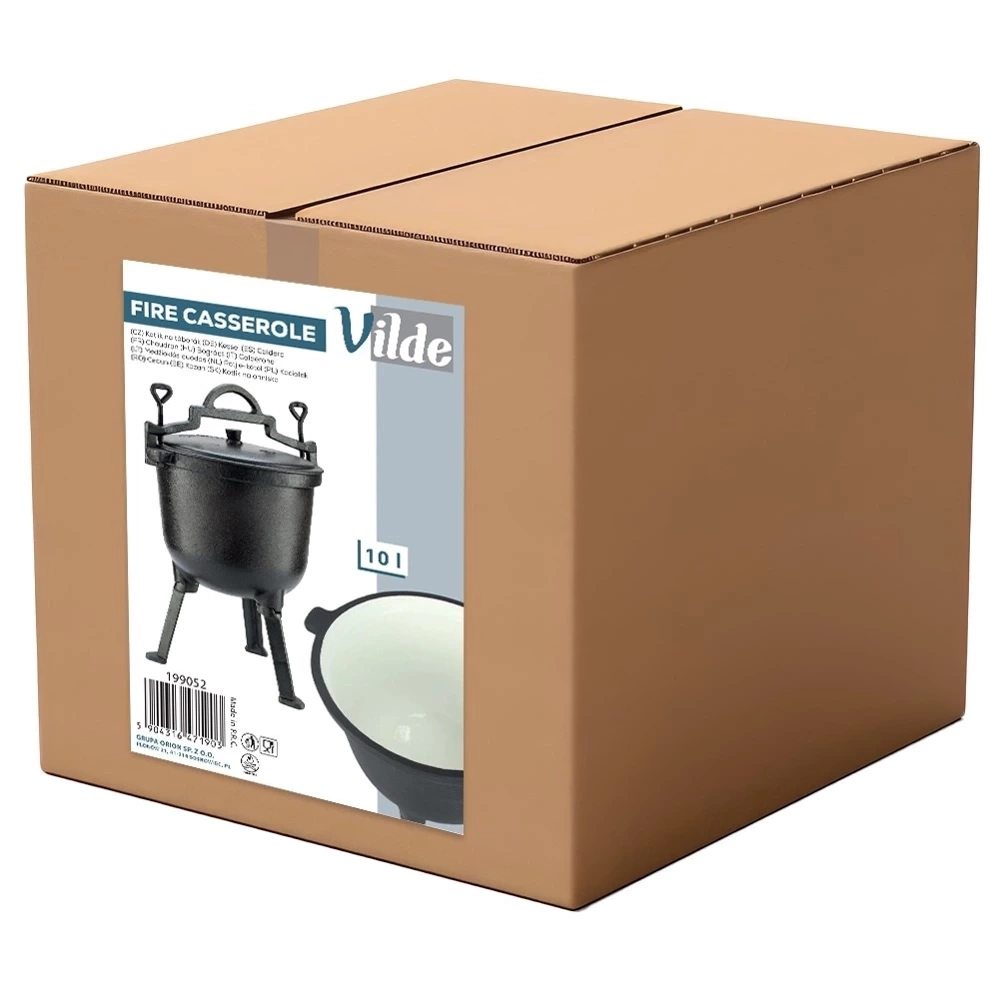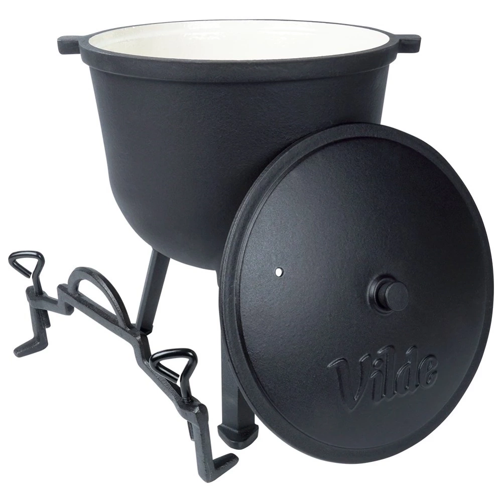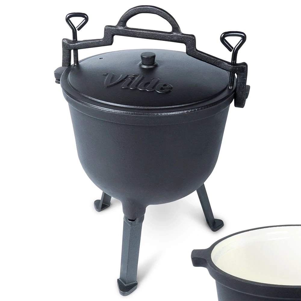 Okrągły kociołek żeliwny na nóżkach z pokrywką i uchwytem do zawieszenia, posiada emaliowany środek. Idealny do gotowania, pieczenia, duszenia oraz smażenia potraw na ognisku, grillu lub nad otwartym ogniem. Potrawy przygotowane w kociołku będą soczyste i aromatyczne. Przydatny w trakcie różnego rodzaju spotkań, uroczystości czy imprez organizowanych na świeżym powietrzu. Oryginalny produkt marki Vilde z linii Cast Line. Wyprodukowano zgodnie z europejskimi standardami.