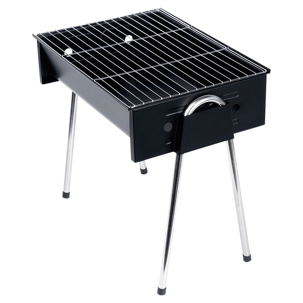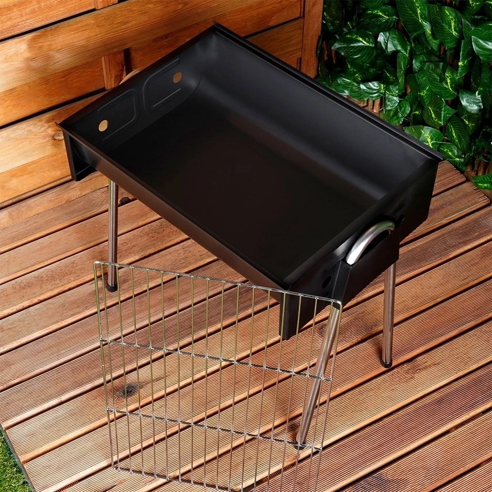 - Grill węglowy na czterech nóżkach, możemy złożyć w łatwy sposób i wygodnie przenieść w kartonie z rączką. Posiada wyjmowany ruszt.