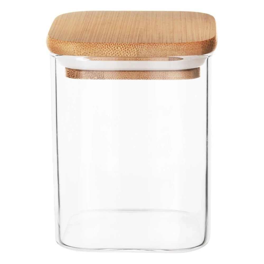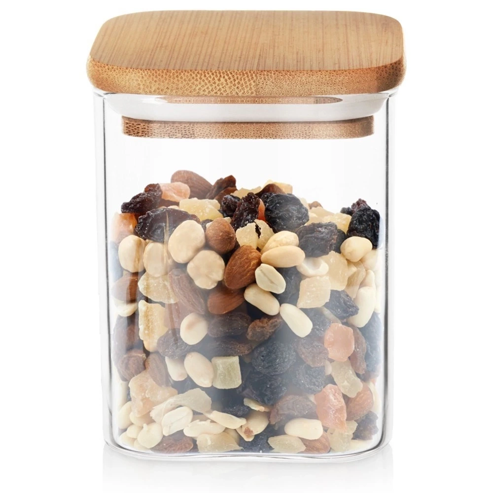 - Pojemnik ze szkła borokrzemowego z pokrywką z drewna bambusowego. Szczelny dzięki silikonowej uszczelce, kwadratowy kształt.