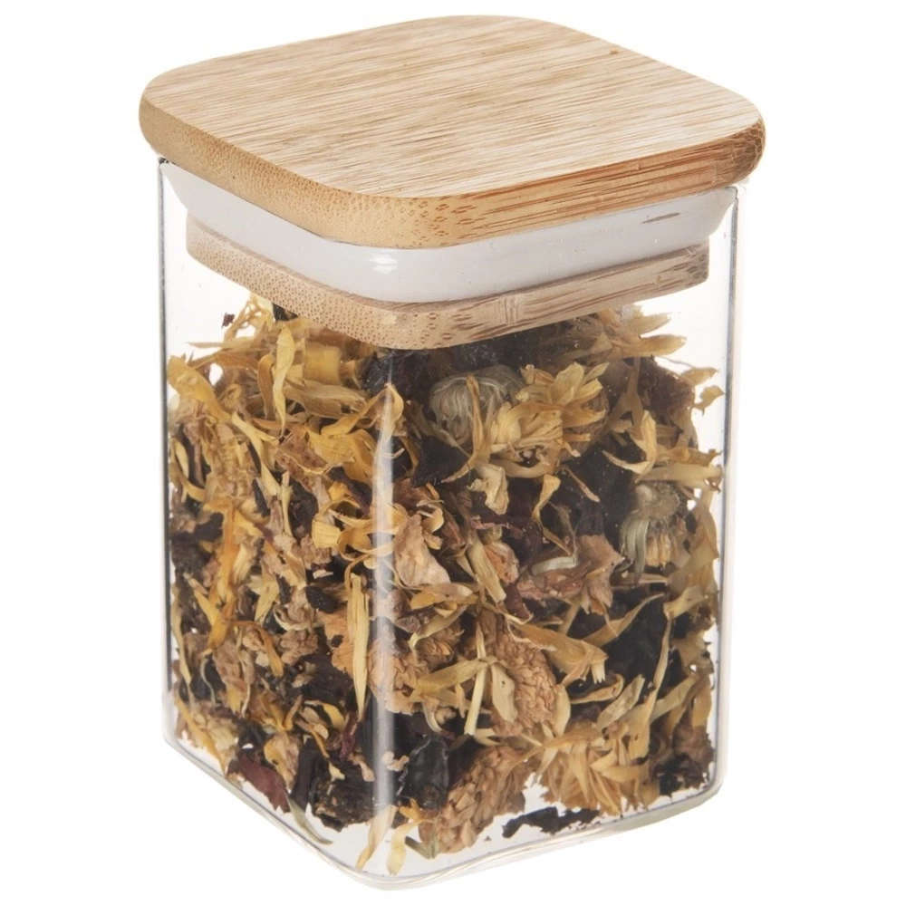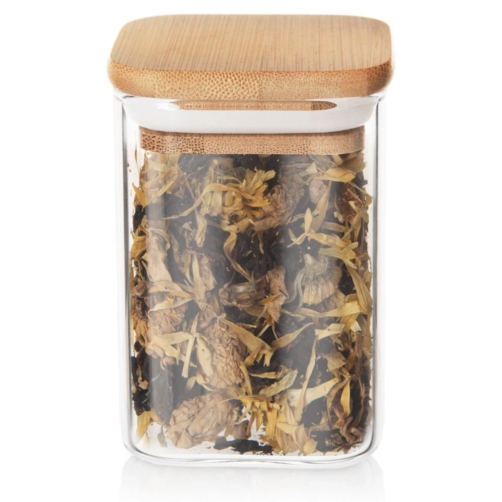 - Pojemnik ze szkła borokrzemowego z pokrywką z drewna bambusowego. Szczelny dzięki silikonowej uszczelce, kwadratowy kształt.