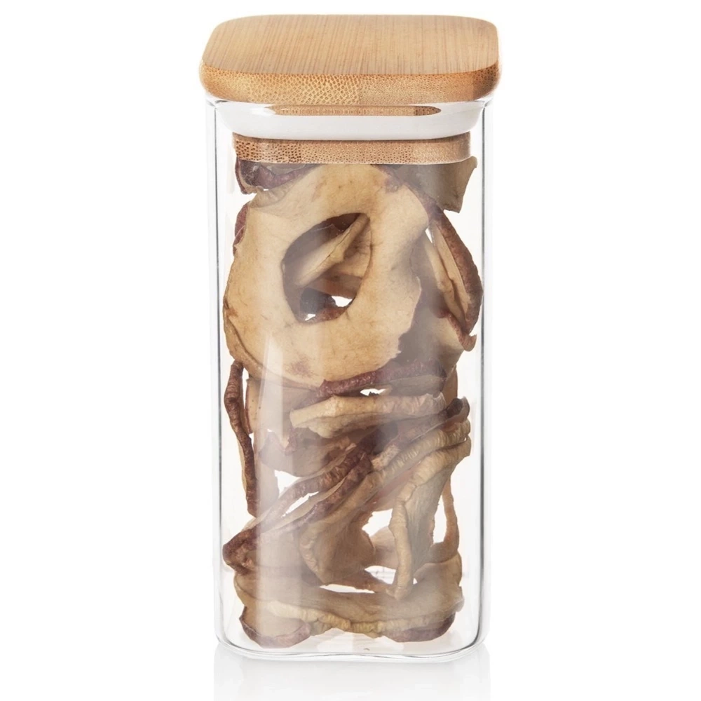 - Pojemnik ze szkła borokrzemowego z pokrywką z drewna bambusowego. Szczelny dzięki silikonowej uszczelce, kwadratowy kształt.