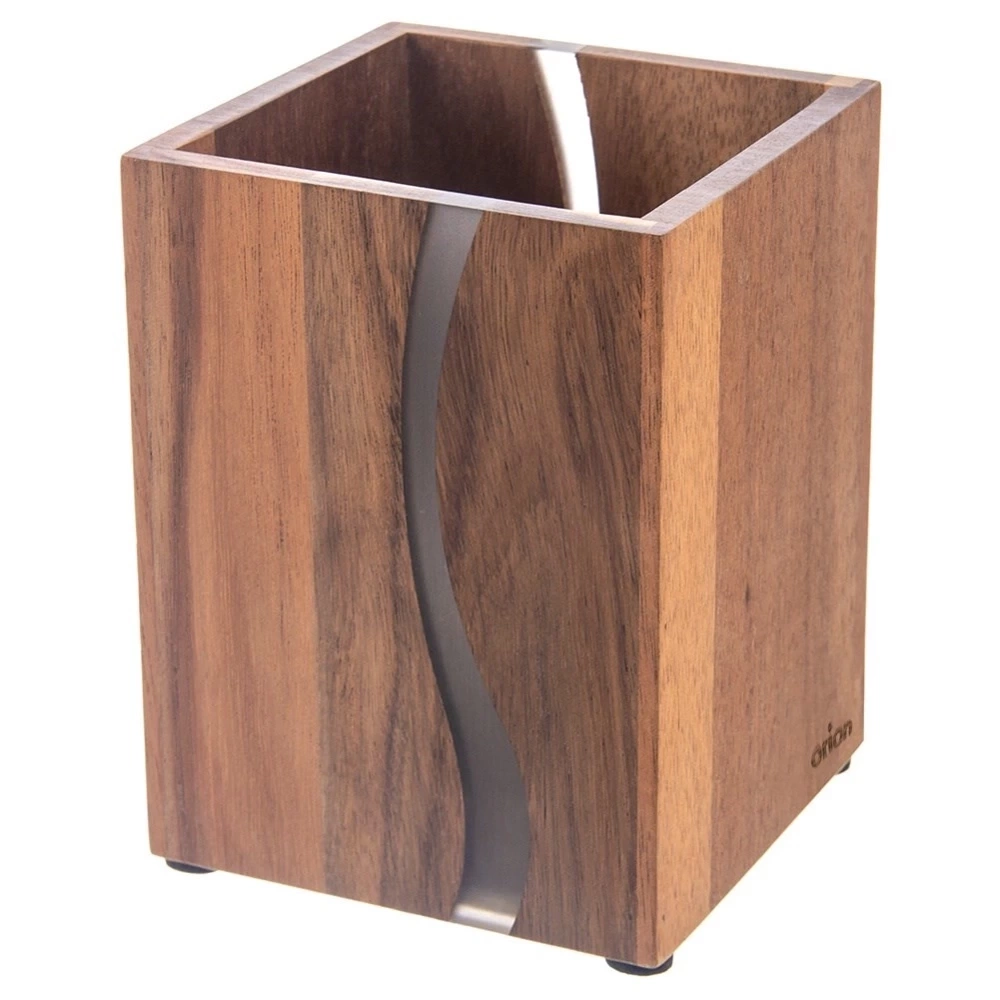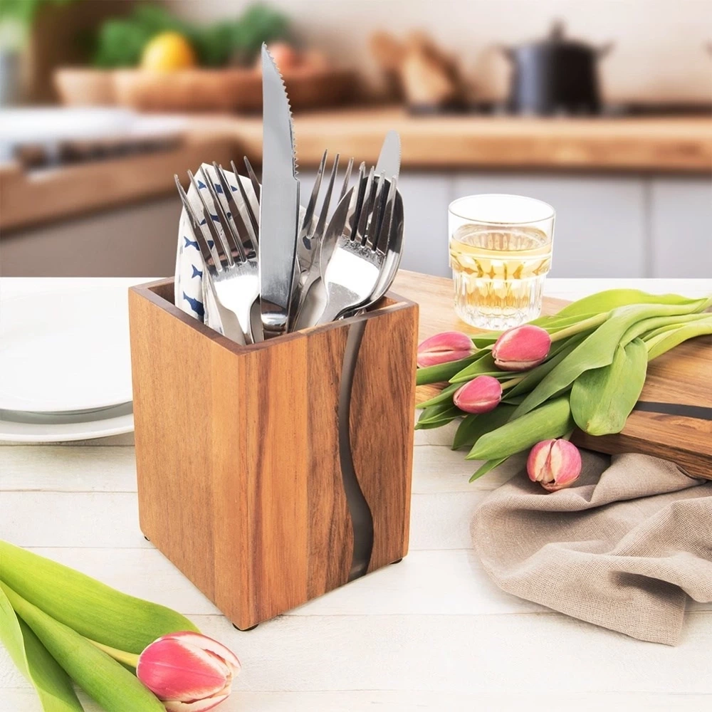 - Stojak na przybory kuchenne z serii River. Wykonany z drewna akacjowego z elementami żywicy Z jego pomocą zapanuje porządek w kuchni.