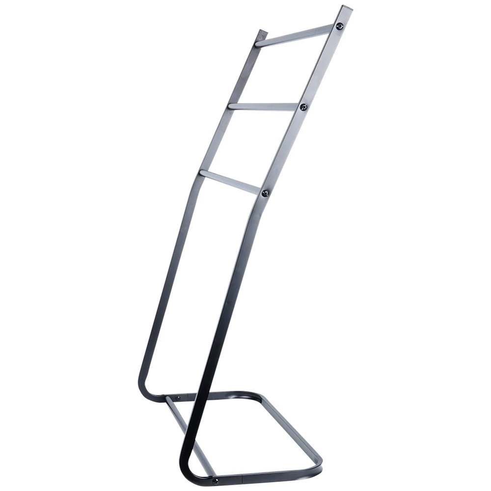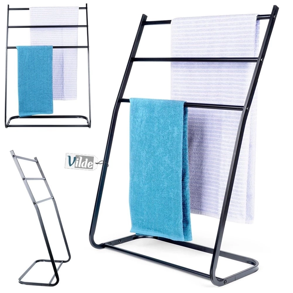 - Praktyczny, wolnostojący wieszak na ręczniki lub ubrania. Posiada 3 poprzeczki do zawieszenia. Wykonany z metalu w kolorze czarnym.