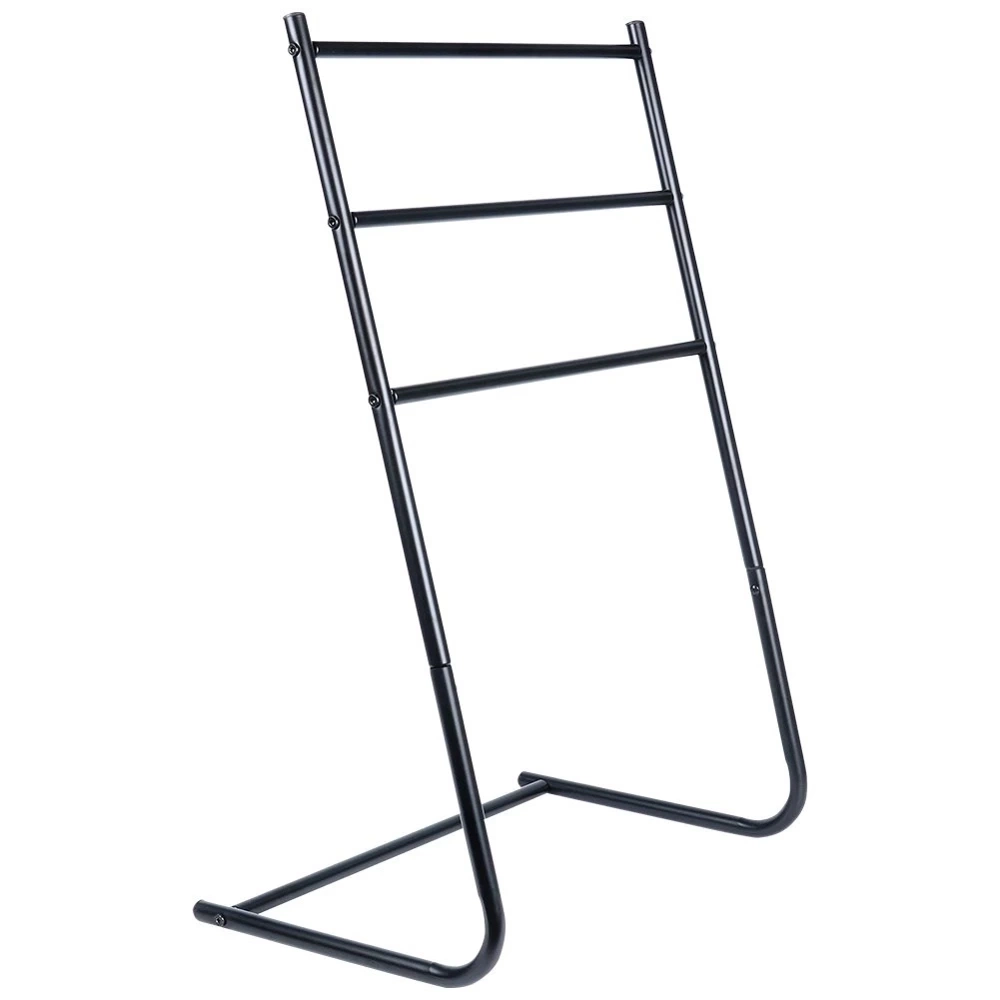 - Praktyczny, wolnostojący wieszak na ręczniki lub ubrania. Posiada 3 poprzeczki do zawieszenia. Wykonany z metalu w kolorze czarnym.