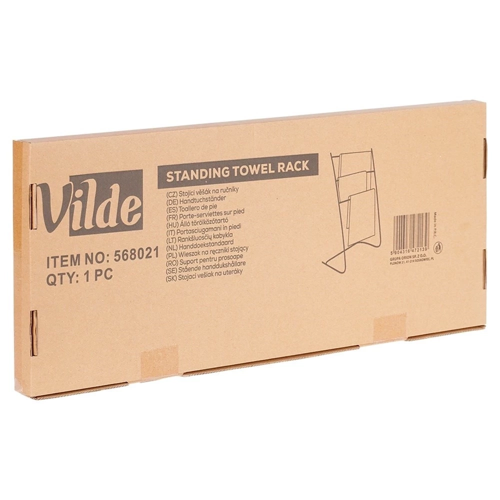 Wolnostojący, metalowy wieszak na ręczniki lub ubrania. Będzie świetnym elementem dekoracyjnym w każdej łazience. Solidna konstrukcja gwarantuje stabilność, umożliwiając wygodne układanie ręczników. Pasuje do każdego wnętrza, zarówno klasycznego, jak i nowoczesnego. Wieszak to niezastąpiony element każdej łazienki, który ułatwi przechowywanie ręczników. Oryginalny produkt marki Vilde. Wyprodukowano zgodnie z europejskimi standardami.
