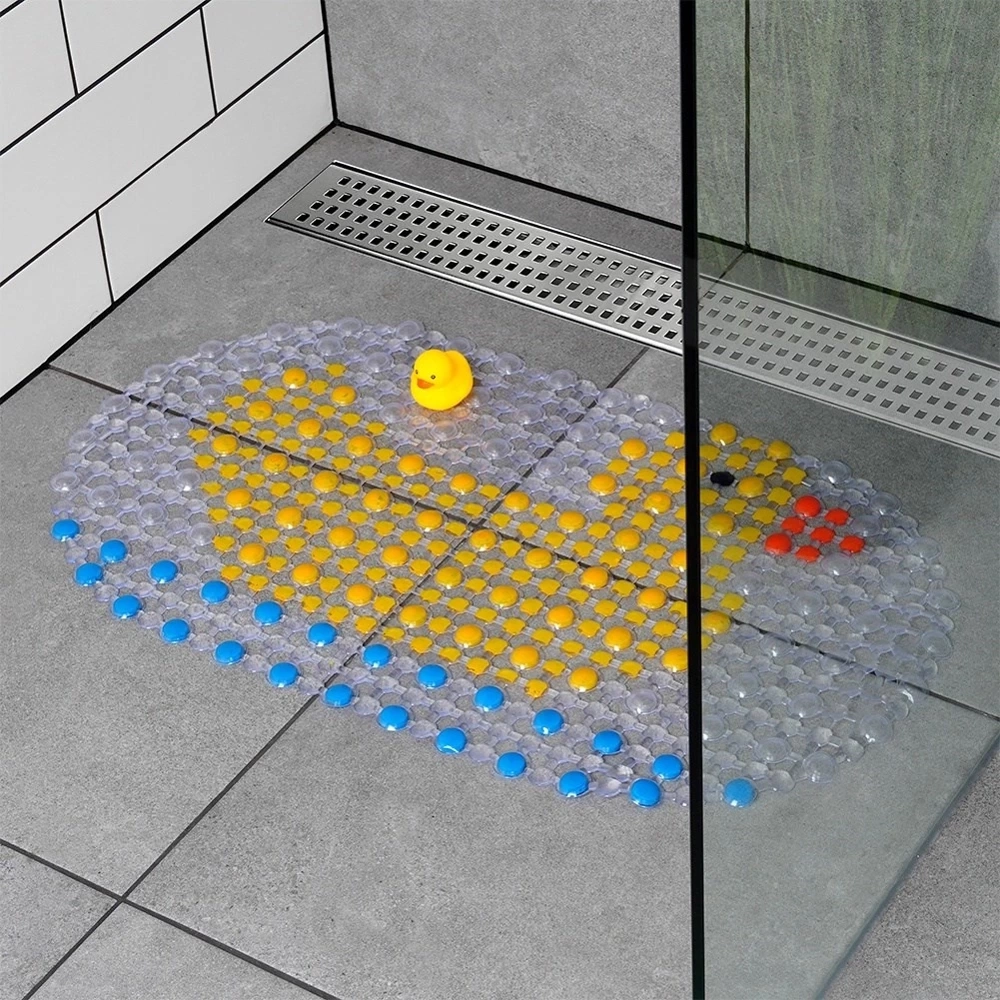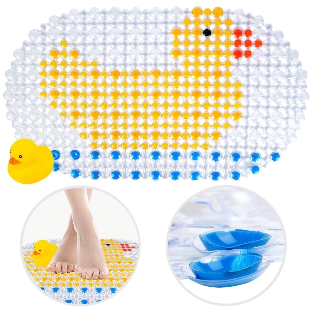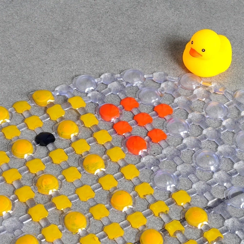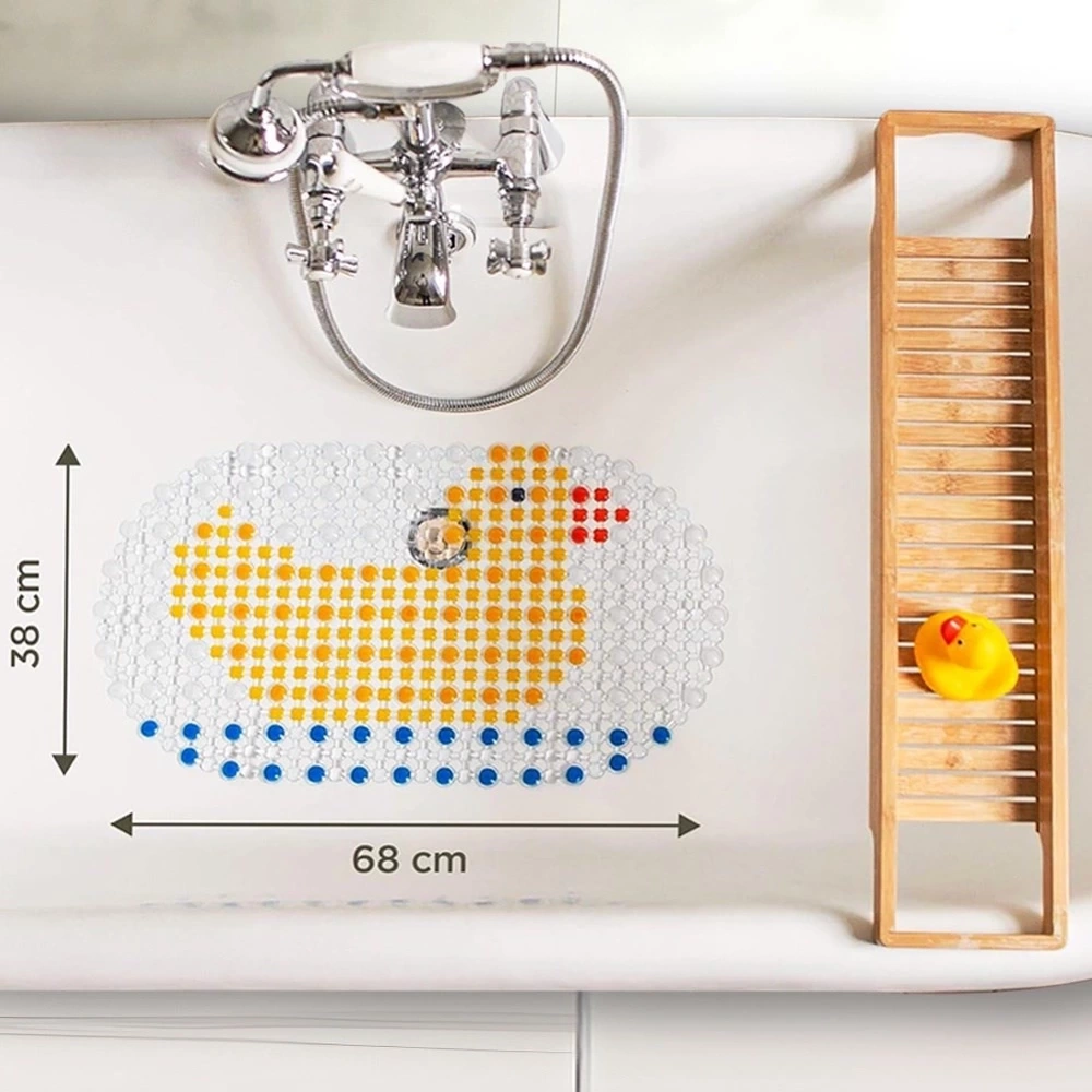 - Mata antypoślizgowa z przyssawkami pod prysznic lub do wanny ogranicza ryzyko poślizgnięcia się na mokrej nawierzchni. W zestawie z piszczącą kaczuszką.