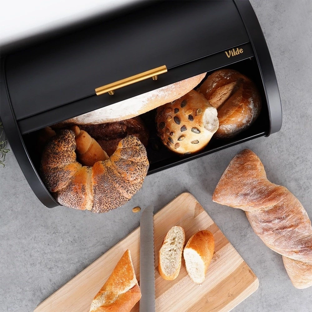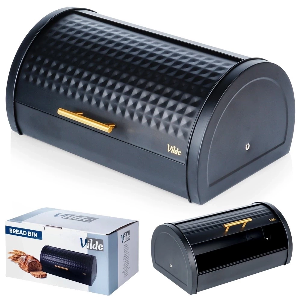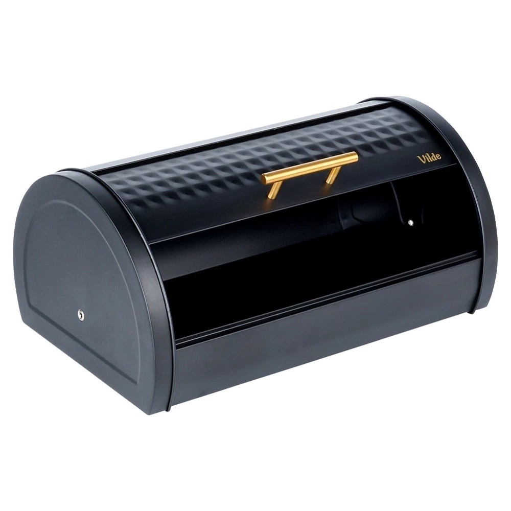 - Pojemny chlebak wykonany z metalu w kolorze czarnym. Posiada uchwyt w kolorze złotym, który zapewni wygodne otwieranie i zamykanie.