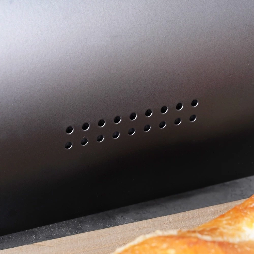 - Wygodne otwieranie i zamykanie - Posiada zamknięcie w formie uchylnej pokrywy. Mechanizm zamknięcia został zaprojektowany z myślą o codziennym użytkowaniu, co sprawia, że otwieranie i zamykanie chlebaka jest szybkie i wygodne.