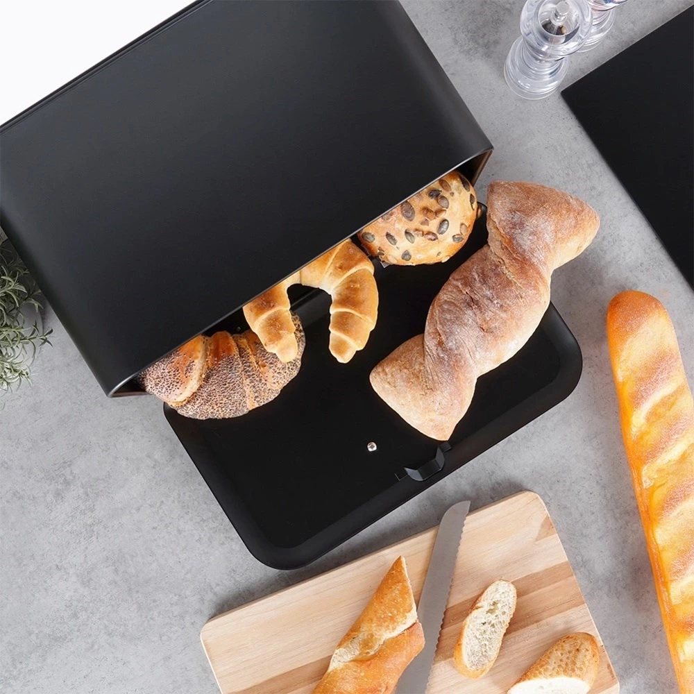 - Wygodne otwieranie i zamykanie - Posiada zamknięcie w formie uchylnej pokrywy. Mechanizm zamknięcia został zaprojektowany z myślą o codziennym użytkowaniu, co sprawia, że otwieranie i zamykanie chlebaka jest szybkie i wygodne.