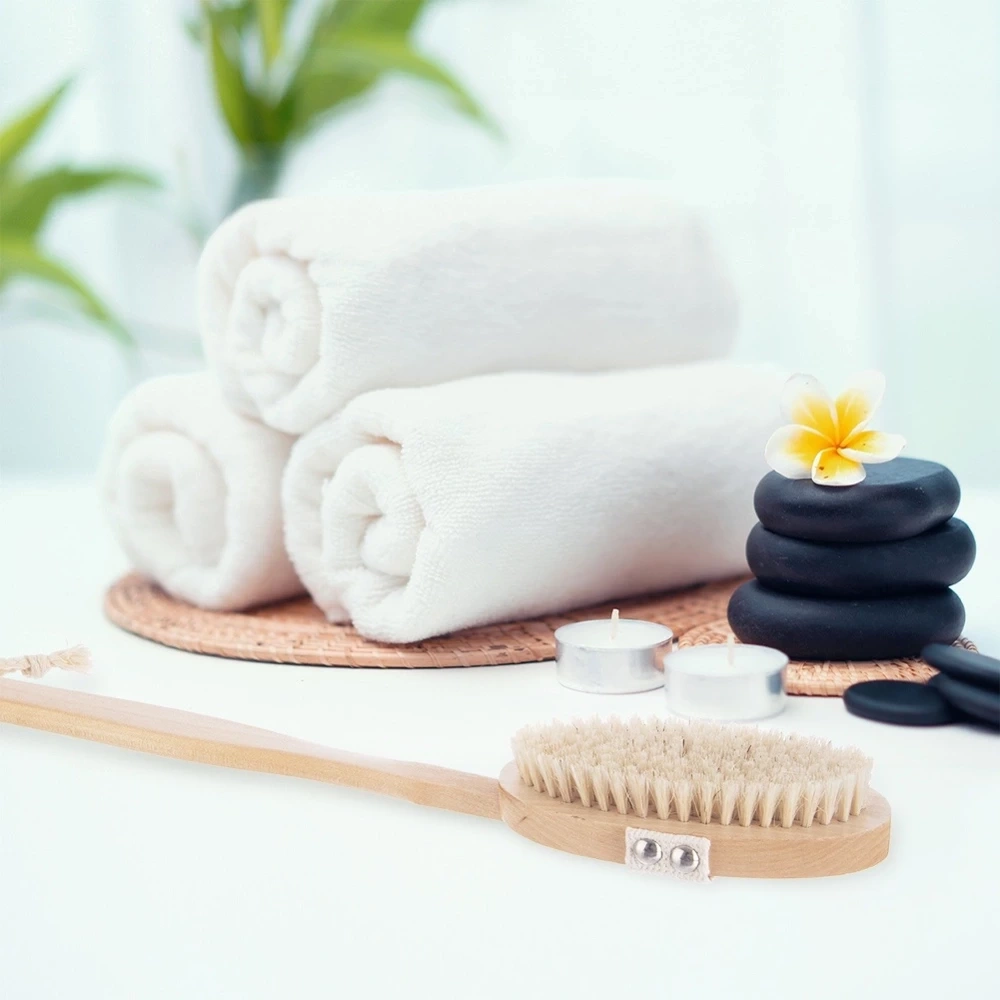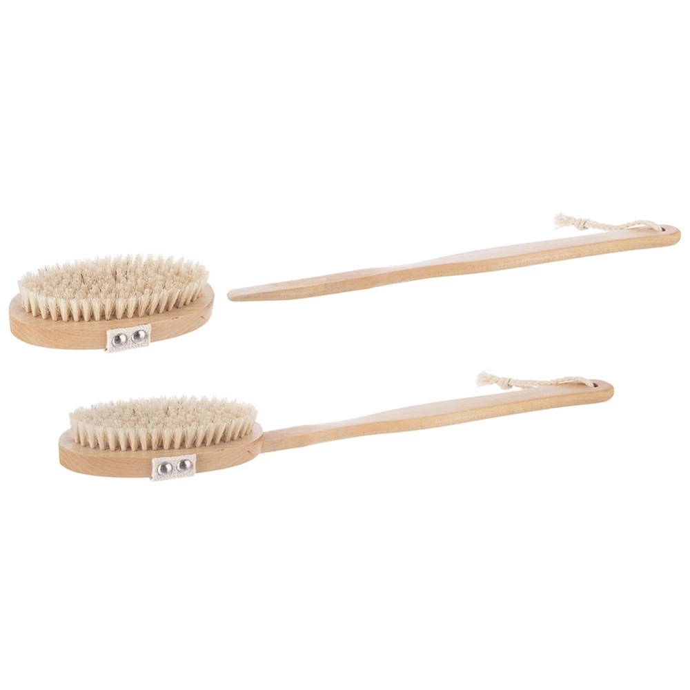 - Szczotka do masażu na sucho i do kąpieli - Szczotka do masażu o długości 42 cm, powierzchnia szczotki wynosi 12,5 x 7 cm. Szczotka jest odpowiednia do masażu ciała na sucho oraz podczas kąpieli w wannie, czy pod prysznicem. Szczotkowanie zapewni gładką i zdrowo wyglądającą skórę. Posiada sznurek, który umożliwi zawieszenie szczotki.