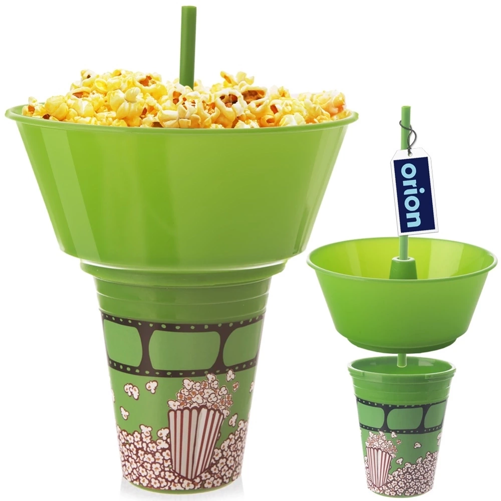 - Kubek z miską na popcorn to funkcjonalne i innowacyjne rozwiązanie, które umożliwia jednoczesne picie napoju i jedzenie przekąsek.
