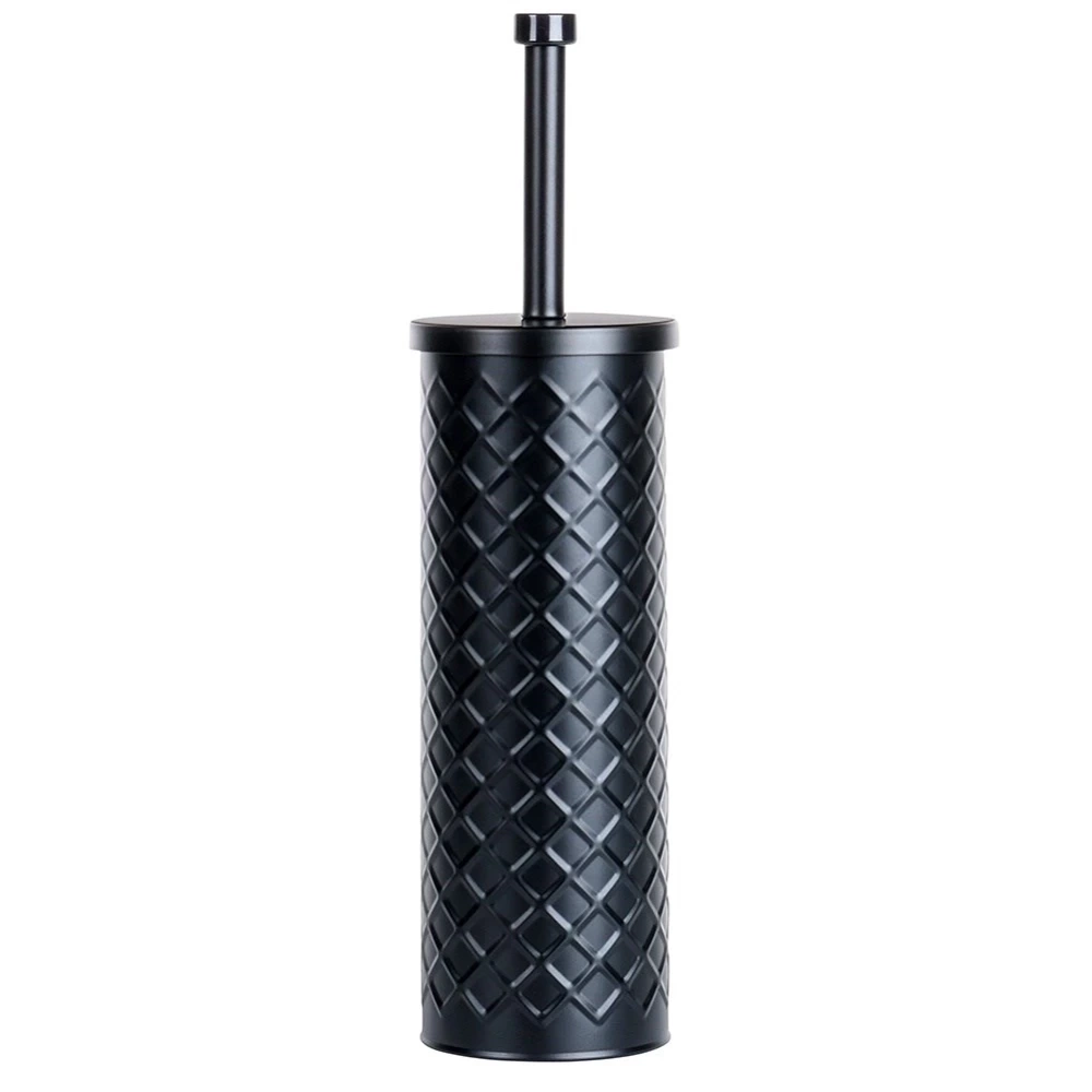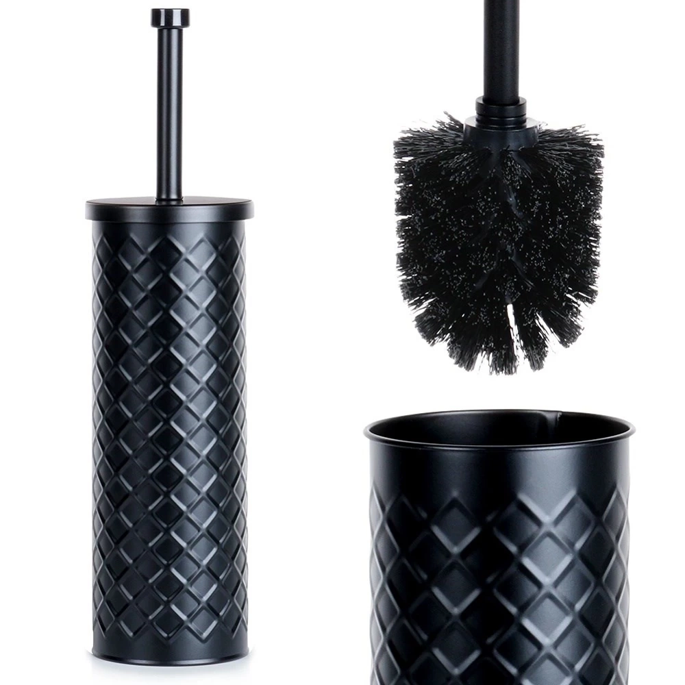 - Metalowy pojemnik z czarną szczotką - Pojemnik oraz uchwyt szczotki wykonane z wysokiej jakości metalu w kolorze czarnym. Pojemnik posiada efektowny wzór. Włosie szczotki jest w kolorze czarnym.